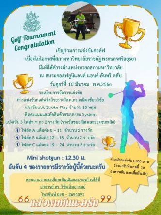 tui sakrapee March 4, 2023 ขอเชิญร่วมแข่งกอล์ฟ ชิงถ้วยรางวัล ‘ศาสตราจารย์ ดร.คณิต เขียววิชัย’ tui sakrapee March 4, 2023 เชิญร่วมการแข่งขันกอล์ฟชิงถ้วยรางวัล ศาสตราจารย์ ดร.คณิต เขียววิชัย เนื่องในโอกาสที่สภามหาวิทยาลัยราชภัฏพระนครศรีอยุธยา มีมติให้ดำรงตำแหน่งนายกสภามหาวิทยาลัย ณ สนามกอล์ฟยูนิแลนด์ แอนด์ คันทรี่ คลับ วันศุกร์ที่ 10 มีนาคม พ.ศ. 2566 ระเบียบการจัดการแข่งขันการแข่งขันกอล์ฟ ชิงถ้วยรางวัลศาสตราจารย์ ดร.คณิต เขียววิชัย แข่งขันแบบ Stroke Play จำนวน 18 หลุม คิดคะแนนและตัดสินด้วยระบบ 36 System แบ่งเป็น 3 ไฟล์ท… Continue Reading