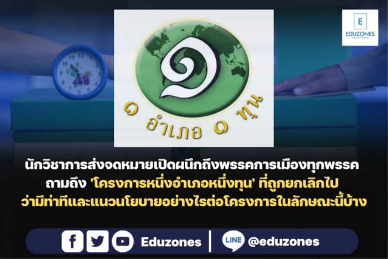 EZ Webmaster March 20, 2023 นักวิชาการส่งจดหมายเปิดผนึกถึงพรรคการเมืองทุกพรรค ถามถึง ‘โครงการหนึ่งอําเภอหนึ่งทุน’ ที่ถูกยกเลิกไป ว่ามีท่าทีและแนวนโยบายอย่างไรต่อโครงการในลักษณะนี้บ้าง EZ Webmaster March 20, 2023 18 มี.ค. 2566 กลุ่มนักวิชาการได้ส่งจดหมายเปิดผนึกถึงพรรคการเมืองทุกพรรค ระบุว่า พวกเราประชาชนผู้สนใจการพัฒนาสังคม อยากทราบว่า ท่านมีนโยบายด้านการศึกษาและการสนับสนุนการพัฒนาบุคลากรจากตําบลหรืออําเภอต่าง ๆ อย่างไรบ้าง แล้วท่านพอรู้จักหรือจํา ‘โครงการหนึ่งอําเภอหนึ่งทุน’ ซึ่งเป็นโครงการกระจายโอกาสและลดความเหลื่อมล้ำทางการศึกษาแต่ถูกยกเลิกไป ได้บ้างหรือไม่ และในวาระอาสาเข้าไปทํางานผ่านการเลือกตั้งที่กําลังจะมาถึง ท่านมีท่าทีและแนวนโยบายอย่างไรต่อโครงการในลักษณะนี้บ้าง ? ดูรายนามผู้ลงชื่อได้ที่นี่ : คลิก Continue Reading