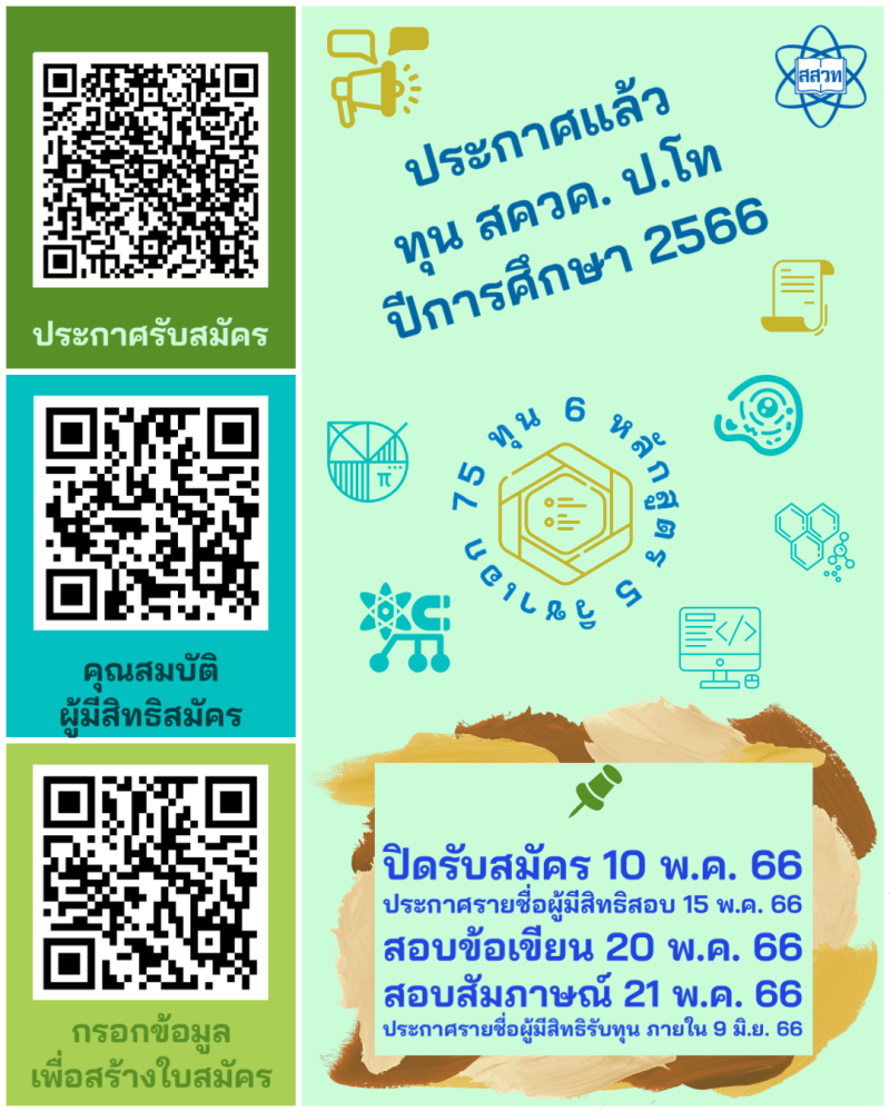 EZ Webmaster April 18, 2023 EZ Webmaster April 18, 2023 ทุนโครงการ สควค. ระยะที่ 4 ประเภท 2 ระดับปริญญาโท – หมดเขต 10 พฤษภาคม 2566 ทุนโครงการ สควค. ระยะที่ 4 ประเภท 2 ระดับปริญญาโท – หมดเขต 10 พฤษภาคม 2566 สถาบันส่งเสริมการสอนวิทยาศาสตร์และเทคโนโลยี (สสวท.) ประกาศรับสมัครคัดเลือกผู้รับทุนโครงการ สควค. ระยะที่ 4 ประเภท 2 ระดับปริญญาโท ประจำปีการศึกษา 2566 ตามงบประมาณที่ได้รับการจัดสรร รวมจำนวน 75 ทุน ครอบคลุม 6 หลักสูตร ดังรายการ (1) – (6) โดยสามารถติดตามประกาศการรับสมัครของแต่ละหลักสูตรได้ดังลิงค์ที่ให้ไว้ตอนท้าย (1) กศ.ม. การสอนวิทยาศาสตร์และคณิตศาสตร์ คณะศึกษาศาสตร์ ม.มหาสารคาม (ประกาศการรับสมัคร) (2) กศ.ม. การสอนวิทยาศาสตร์และคณิตศาสตร์ คณะศึกษาศาสตร์ ม.ทักษิณ (ประกาศการรับสมัคร) (3) กศ.ม. การสอนวิทยาศาสตร์ คณะศึกษาศาสตร์ ม.บูรพา (ประกาศการรับสมัคร) (4) กศ.ม. การสอนคณิตศาสตร์ คณะศึกษาศาสตร์ ม.บูรพา (ประกาศการรับสมัคร) (5) กศ.ม. เทคโนโลยีดิจิตัลเพื่อการศึกษาและคอมพิวเตอร์ศึกษา คณะศึกษาศาสตร์ ม.บูรพา (ประกาศการรับสมัคร) (6) ค.ม. คอมพิวเตอร์ศึกษา คณะครุศาสตร์ ม.ราชภัฏมหาสารคาม (ประกาศการรับสมัคร) . ผู้สนใจอ่านรายละเอียดเพิ่มเติมจากประกาศการรับสมัครของ สสวท. และประกาศคุณสมบัติผู้มีสิทธิสมัคร รวมถึงสามารถกรอกข้อมูลเพื่อสร้างใบสมัครฯ ได้ที่ https://www.ipst.ac.th/unit-psmt ในเมนู “ประกาศเกี่ยวกับทุน สควค.” แล้วนำไปใช้สมัครกับหลักสูตรที่เลือกศึกษา พร้อมส่งเอกสารหลักฐานการสมัครอื่นให้ครบถ้วนตามที่ระบุ . สอบถามข้อมูลที่เกี่ยวข้องได้จาก ฝ่าย สควค. ผ่านอีเมล psmt@ipst.ac.th โดยอาจศึกษาข้อมูลเบื้องต้นเกี่ยวกับทุนโครงการ สควค. ระยะที่ 4 ในเมนู “Q&A ทุนระยะที่ 4” และรายละเอียดการรับสมัครได้จากหลักสูตรที่สนใจเลือกศึกษา . สำหรับการสอบคัดเลือกด้วยชุดข้อสอบประเมินความรู้ในวันสอบข้อเขียน ผู้สนใจสามารถศึกษารายละเอียดกรอบความรู้สาขาวิชาต่างๆ เพื่อเตรียมตัวสอบ ได้ที่โพสต์นี้ . แหล่งที่มา : คลิก .