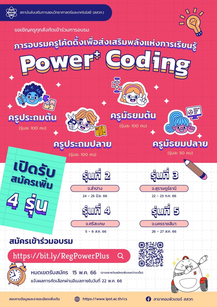 EZ Webmaster May 8, 2023 EZ Webmaster May 8, 2023 สสวท. อบรม Power+ Coding รับเพิ่ม 4 รุ่นส่งเสริมพลังการเรียนรู้ครูโค้ดดิ้ง สมัครด่วนถึง 15 พ.ค.นี้ สถาบันส่งเสริมการสอนวิทยาศาสตร์และเทคโนโลยี (สสวท.) ขอเชิญครูโค้ดดิ้งร่วมโค้ชชิ่งนักเรียนไทยกับการอบรม Power+ Coding หลักสูตรอบรมครูโค้ดดิ้งเพื่อส่งเสริมพลังแห่งการเรียนรู้ สำหรับครูระดับประถมศึกษาและมัธยมศึกษา ทุกสังกัดในส่วนภูมิภาคทั่วประเทศ เปิดรับสมัครเพิ่ม 4 รุ่น อบรมแบบพบหน้า แต่ละรุ่น แต่ละระดับรับจำนวนจำกัด โดยจะแจ้งสถานที่อบรมในภายหลัง ดูรายละเอียดและสมัครออนไลน์ที่ https://bit.ly/RegPowerPlus สอบถามที่ Facebook สาขาคอมพิวเตอร์ สสวท. https://www.facebook.com/oho.ipst สมัครได้จนถึง 15 พฤษภาคม 2566 แจ้งผลการคัดเลือกผ่านอีเมล์ภายในวันที่ 22 พฤษภาคม 2566 ระดับประถมศึกษาถึงมัธยมศึกษาตอนต้น เน้นสร้างความรู้ความเข้าใจในเนื้อหา Misconceptions พร้อมทั้งเสริมพลังการวัดและประเมินผล และการเป็น facilitator ในชั้นเรียนวิทยาการคำนวณ สำหรับระดับมัธยมศึกษาตอนปลาย หลักสูตร intrend เสริมพลังการพัฒนาโครงงาน AI และพัฒนาผู้เรียนด้วย Formative Assessment
