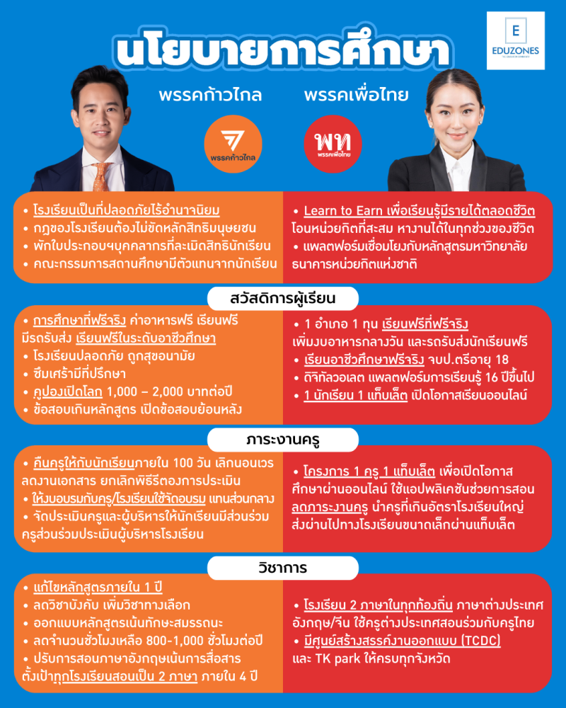 EZ Webmaster May 17, 2023 EZ Webmaster May 17, 2023 ย้อนดูนโยบายการศึกษา พรรคก้าวไกลและพรรคเพื่อไทย ในการรายงานผลการนับคะแนนอย่างไม่เป็นทางการเลือกตั้ง 2566 พรรคการเมืองที่มีจำนวนสส.มาเป็นอันดับหนึ่งและสอง คือ พรรคก้าวไกลและพรรคเพื่อไทย Eduzones พามาย้อนดูนโยบายการศึกษาที่ทั้งสองพรรคได้เสนอนโยบายบายอะไรกันไว้บ้าง พรรคก้าวไกล นายพริษฐ์ วัชรสินธุ ผู้จัดการการสื่อสารและการรณรงค์นโยบาย พรรคก้าวไกล กล่าวในดีเบตหลุมดำการศึกษาไทย จากช่อง PPTVHD36 ถึงปัญหาการศึกษาที่ผ่านมาว่าขาดประสิทธิภาพ เด็กไทยเรียนหนักแต่หลักสูตรไม่มีประสิทธิภาพที่จะแปรความขยันเรียนเป็นทักษะที่แข่งขันกับนานาชาติได้ ไม่สามารถแปรงบประมาณออกเป็นการวางหลักการสิทธิในการเรียนฟรีได้ ต้องมีการเพิ่มความเห็นอกเห็นใจเปลี่ยนการศึกษาจากแบบอำนาจนิยมที่มองว่าเด็กที่ดีควรเป็นอย่างไร เป็นการสร้างพื้นที่ปลอดภัยให้มีเสรีภาพทางการเรียนรู้ เติบโตได้อย่างเต็มศักยภาพ โอบรับความหลากหลายของผู้เรียน รวมนโยบายการศึกษาของพรรคก้าวไกล ได้แก่ โรงเรียนเป็นที่ปลอดภัยไร้อำนาจนิยมภายใน 2 ปี กฎระเบียบของโรงเรียนต้องไม่ขัดหลักสิทธิมนุษยชน ยกเลิกกฎระเบียบเรื่องทรงผม ยกเลิกกฎระเบียบที่เปิดช่องให้มีการลงโทษหรือใช้ความรุนแรงกับผู้เรียน พักใบประกอบวิชาชีพบุคคลากรที่มีส่วนละเมิดสิทธิมนุษยชนนักเรียนแทนการย้ายไปโรงเรียนอื่น จัดให้มีการประเมินทั้งครูและผู้บริหารโรงเรียน นักเรียนมีส่วนร่วมในการประเมินครูมีความยึดโยงกับผลสัมฤทธิ์และความพึงพอใจของนักเรียนในฐานะผู้รับบริการการศึกษา ครูมีส่วนร่วมในการประเมินผู้บริหารโรงเรียน เพื่อให้ผู้บริหารถูกประเมินจากข้อมูลที่รอบด้าน และป้องกันการใช้อำนาจในทางที่ไม่ชอบกับครู แก้งบประมาณ จัดสรรทรัพยากรในการจัดการศึกษาที่มีคุณภาพ เพิ่มงบประมาณ 33,000 ล้านบาท 4,000 ล้านบาทไปที่กสศ. 29,000 ล้านบาท เพิ่มงบประมาณรายหัวในส่วนค่าอาหารฟรี เรียนฟรี มีรถรับส่ง ให้กับเด็กทุกคนกระจายงบให้กับโรงเรียนขนาดเล็กอย่างเป็นธรรมมากขึ้น ปรับสูตรคำนวณไม่ได้พึ่งแค่จำนวนนักเรียนเป็นหลัก คืนครูให้กับนักเรียนภายใน 100 วัน ยกเลิกกิจกรรมต่าง ๆ ที่ไม่เกี่ยวข้องกับกิจกรรมพัฒนาผู้เรียน เช่น การนอนเวร งานธุรการ จัดจ้างเจ้าหน้าที่ธุรการมาทำหน้าที่แทน ยกเลิกพิธีกรรมที่เกี่ยวข้องกับการประเมิน เปลี่ยนงบประมาณการอบรมครูจากส่วนกลาง เป็นการให้เงินตรงไปที่ ครูแต่ละคนใช้ซื้อคอร์สอบรมพัฒนาทักษะที่ได้รับการรับรองจากกระทรวงศึกษาธิการ หรือโรงเรียนใช้ในการจัดอบรมเพื่อ