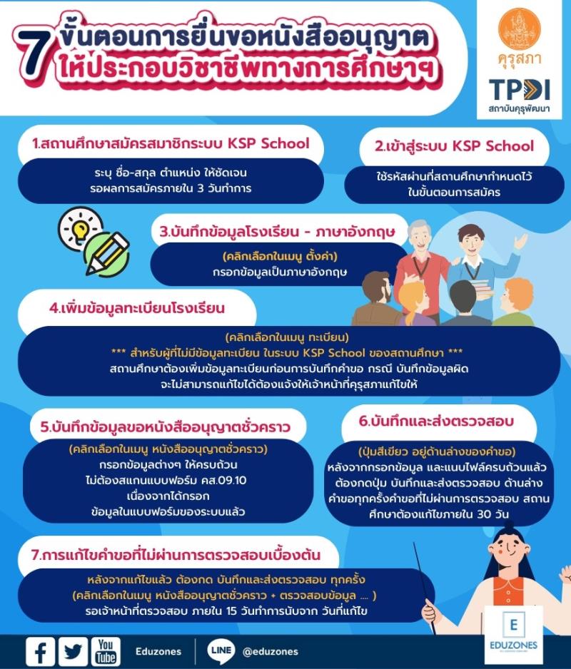 EZ Webmaster May 22, 2023 EZ Webmaster May 22, 2023 การขอใบประกอบวิชาชีพผ่านระบบ KSP School การขอใบประกอบวิชาชีพผ่านระบบ KSP School การขอใบประกอบวิชาชีพผ่านระบบ KSP School . สถานศึกษาสมัครสมาชิกระบบ KSP School กรอกข้อมูลในหนังสือแต่งตั้งผู้ประสานงานให้ครบถ้วน และระบุ ชื่อ-สกุล ตำแหน่งของผู้อำนวยการ หรือ ผู้รับใบอนุญาตให้ชัดเจน รอผลการสมัครภายใน 3 วันทำการ คุรุสภาแจ้งผลการสมัครสมาชิกทาง mail ที่ระบุไว้ หลังจากสมัครผ่านแล้ว หากลืมรหัสผ่าน ให้ใช้ mail ผู้ประสานงานติดต่อได้ที่ itksp@ksp.or.th เข้าสู่ระบบ KSP School บันทึกข้อมูลโรงเรียน – ภาษาอังกฤษ (คลิกเลือกในเมนูตั้งค่า) กรอกข้อมูลเป็นภาษาอังกฤษ เพื่อใช้สำหรับการพิมพ์หนังสืออนุญาตชั่วคราว (2 ภาษา) เพิ่มข้อมูลทะเบียนโรงเรียน (คลิกเลือกในเมนู ทะเบียน) *** สำหรับผู้ที่ไม่มีข้อมูลทะเบียน ในระบบ KSP School ของสถานศึกษา *** สถานศึกษาต้องเพิ่มข้อมูลทะเบียนก่อนการบันทึกคำขอ กรณี บันทึกข้อมูลผิด เช่น พิมพ์ชื่อผิด สถานศึกษา ไม่ต้องแก้ไข ให้ดำเนินการบันทึกคำขอได้ กรณี บันทึกข้อมูลผิด จะไม่สามารถแก้ไขได้ ต้องแจ้งให้เจ้าหน้าที่คุรุสภาแก้ไขให้ โดยการพิมพ์หนังสือแจ้งแนบ ไปพร้อมคำขอ โดยแนบในหัวข้อ สำหรับเจ้าหน้าที่ หลังจากเพิ่มข้อมูลทะเบียนสำเร็จ จะปรากฎรายชื่อบุคคลในหัวข้อ ข้อมูลทะเบียน กรณีขอครั้งที่ 1 ไม่ต้องกรอกข้อมูล “ประเภทใบอนุญาตประกอบวิชาชีพที่ได้รับ” บันทึกข้อมูลขอหนังสืออนุญาตชั่วคราว (คลิกเลือกในเมนู หนังสืออนุญาตชั่วคราว) กรอกเลขบัตรประชาชน หรือเลขประจำตัวคุรุสภา สำหรับครูชาวต่างประเทศ จะปรากฏข้อมูลบางส่วน กรอกข้อมูลต่างๆ ให้ครบถ้วน การพิมพ์ที่อยู่ ตำบล อำเภอ จังหวัด ต้องเลือกจากลูกศรสีเทา ไม่ควรพิมพ์อาจจะทำให้บันทึกคำขอไม่ได้ การพิมพ์ข้อมูล ไม่ควรมีเครื่องหมาย %&#$* การระบุเหตุผลความจำเป็นของสถานศึกษาฯ ควรเลือกตามหัวข้อ หากพิมพ์รายละเอียดต้องไม่ยาว ไม่ต้องสแกนแบบฟอร์ม คส.09.10 เนื่องจากได้กรอกข้อมูลในแบบฟอร์มของระบบแล้ว การแนบไฟล์เอกสารหลักฐานประกอบคำขอ ในแต่ละหัวข้อ จะแนบได้ 1 ไฟล์ ต้องสแกนทุกหน้ารวมกัน เช่น สำเนาใบรายงานผลการศึกษาทุกหน้า รวมเป็นไฟล์เดียวกัน ไฟล์ที่สแกนขนาดต้องไม่เกิน 2 MB (ไม่ควรเป็นสี) ต้องเป็นไฟล์ PDF สามารถใช้กล้องถ่ายรูปเอกสารได้ และนำไปวางไว้ใน word ให้ครบทุกหน้า และ save เป็นไฟล์ PDF บันทึกและส่งตรวจสอบ (ปุ่มสีเขียว อยู่ด้านล่างของคำขอ) หลังจากกรอกข้อมูล และแนบไฟล์ครบถ้วนแล้ว ต้องกดปุ่ม บันทึกและส่งตรวจสอบ ด้านล่างคำขอทุกครั้ง หลังจาก บันทึกและส่งตรวจสอบเรียบร้อย จะปรากฏชื่อบุคคลใน หัวข้อ หนังสืออนุญา