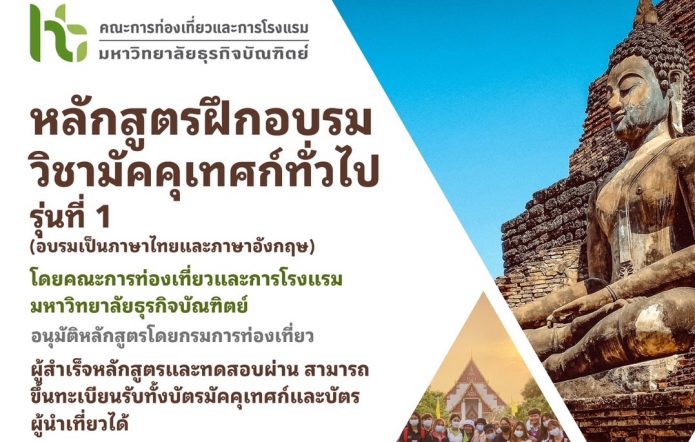EZ Webmaster May 19, 2023 คณะการท่องเที่ยวฯ มธบ.เปิดอบรม หลักสูตร “มัคคุเทศน์ รุ่นที่ 1” จบหลักสูตรพร้อมขึ้นทะเบียนรับบัตรประกอบวิชาชีพ EZ Webmaster May 19, 2023 คณะการท่องเที่ยวและการโรงแรม มหาวิทยาลัยธุรกิจบัณฑิตย์ (มธบ.) เปิดรับสมัครผู้สนใจเข้าอบรมใน หลักสูตรการฝึกอบรมวิชามัคคุเทศก์ทั่วไป (บัตรบรอนซ์เงิน) DPU รุ่นที่ 1 โดยผู้ผ่านการอบรมสามารถขึ้นทะเบียนรับบัตรประกอบวิชาชีพได้ 2 ประเภท ได้แก่ (1) บัตรมัคคุเทศก์ประเภท Inbound และ Domestic และ (2) บัตรมัคคุเทศก์ประเภท Outbound สำหรับทีมวิทยากรและอาจารย์ในหลักสูตร ประกอบไปด้วยผู้เชี่ยวชาญด้านการท่องเที่ยวระดับประเทศ ได้แก่ อ.สร้อยนภา พันธุ์คง ที่ปรึกษาสมาคมมัคคุเทศก์อาชีพฯ และผู้ฝึกสอนระดับประเทศในนามสมาพันธ์มัคคุเทศก์โลก (WFTGA), อ.สุระชาติ สวนทรัพย์ มัคคุเทศก์อาวุโส, อ.กฤติเดซ ทองเพิ่ม ผู้ช่วยประธานสภาอุตสาหกรรมท่องเที่ยวแห่งประเทศไทย, รศ.ดร.รุ่งโรจน์ ภิรมย์อนุกูล ผู้เชี่ยวชาญด้านโบราณคดีและประวัติศาสตร์, อ.ธนกฤต ลออสุวรรณ อาจารย์ประจำภาควิชาประวัติศาสตร์… Continue Reading