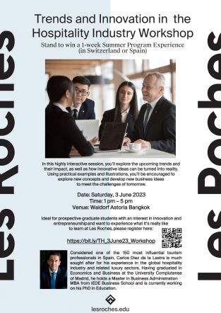 tui sakrapee May 19, 2023 โอกาสทองของนักศึกษา! ชวนเวิร์คช็อป Trends and Innovation in the Hospitality Industry พร้อมลุ้นรับ Summer Program 1 สัปดาห์ที่สวิสหรือสเปน tui sakrapee May 19, 2023 ขอเชิญเข้าร่วมเวิร์คช็อป Trends and Innovation in the Hospitality Industry พร้อมโอกาสรับรางวัล Summer Program 1 สัปดาห์ที่สวิตเซอร์แลนด์หรือสเปน ผู้เข้าร่วมจะได้ทราบถึงแนวโน้มที่กำลังจะมาและผลกระทบที่อาจเกิดขึ้นในอนาคตต่อธุรกิจการโรงแรม การท่องเที่ยวและการบริการ เรียนรู้แนวทางที่จะเปลี่ยนความคิดสร้างสรรค์สู่ผลงานที่จับต้องได้ อีกทั้งมีส่วนร่วมค้นหาและพัฒนาแนวคิดธุรกิจรูปแบบใหม่ที่จะตอบโจทย์กับโลกของอนาคต วันเสาร์ที่ 3 มิถุนายน 2566 เวลา: 13.00 – 17.00 น สถานที่: Waldorf Astoria Bangkok เวิร์คช็อปสำหรับนักศึกษาระดับบัณฑิตศึกษา ที่มีความสนใจในนวัตกรรมและการเป็นผู้ประกอบการที่ต้องการสัมผัสประสบการณ์การศึกษาที่… Continue Reading