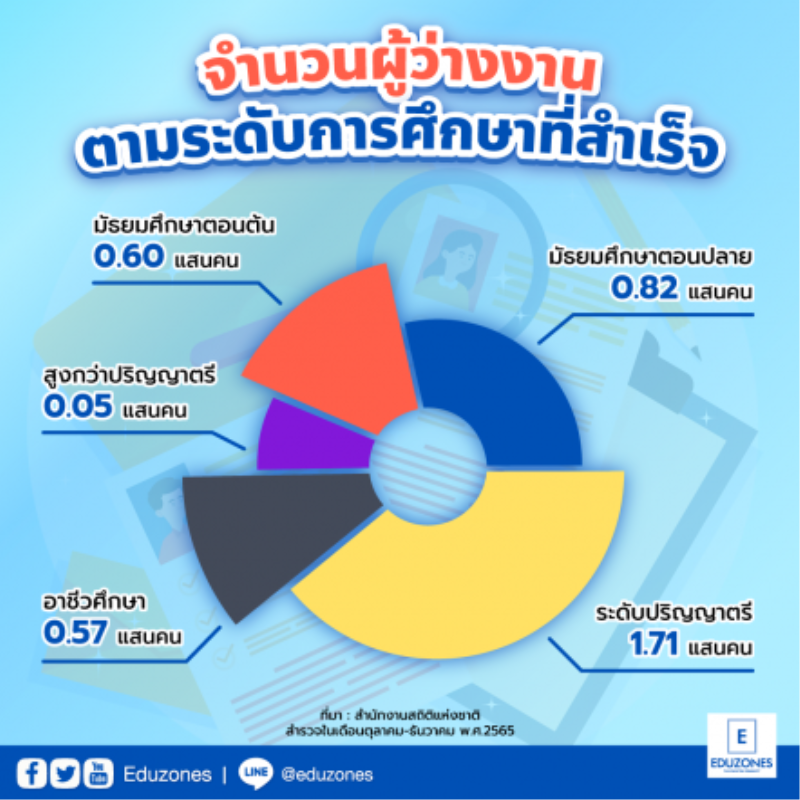 EZ Webmaster May 3, 2023 สำนักงานสถิติแห่งชาติเปิดจำนวนผู้ว่างงาน สิ้นสุดไตรมาสที่ 4 พ.ศ.2565 จบปริญญาตรียังตกงานมากสุด 1.71 แสนคน EZ Webmaster May 3, 2023 สำนักงานสถิติแห่งชาติ ได้สำรวจภาวะการทำงานของประชากรไตรมาสที่ 4 พ.ศ. 2565 (ดำเนินการสำรวจในเดือนตุลาคม – ธันวาคม พ.ศ. 2565 ) เพื่อให้ทราบถึงภาวะการทำงานและการว่างงานของประชากร ผลการสำรวจพบว่า มีจำนวนผู้ที่มีอายุตั้งแต่ 15 ปีขึ้นไป ทั้งสิ้น58.73 ล้านคน เป็นผู้อยู่ในกำลังแรงงาน 40.14 ล้านคน(ประกอบด้วยผู้มีงานทำ 39.59 ล้านคน ผู้ว่างงาน 0.46 ล้านคนและผู้รอฤดูกาล 0.09 ล้านคน) และผู้อยู่นอกกำลังแรงงาน18.59 ล้านคน (ประกอบด้วยผู้ทำงานบ้าน 5.20… Continue Reading