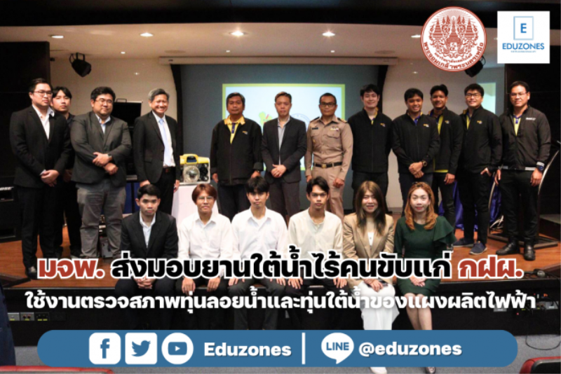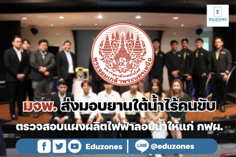 EZ Webmaster June 26, 2023 มจพ. ส่งมอบยานใต้น้ำไร้คนขับ ตรวจสอบแผงผลิตไฟฟ้าลอยน้ำให้แก่ กฝผ. EZ Webmaster June 26, 2023 ยานใต้น้ำไร้คนขับเพื่อตรวจสอบแผงผลิตไฟฟ้าลอยน้ำ เป็นทุนวิจัย และพัฒนานวัตกรรมที่การไฟฟ้าฝ่ายผลิตแห่งประเทศไทย (กฟผ.) ว่าจ้างมหาวิทยาลัยเทคโนโลยีพระจอมเกล้าพระนครเหนือ (มจพ.) ดำเนินงานโดยมี รองศาสตราจารย์ ดร.รามิล เกศวรกุล อาจารย์ประจำภาควิชาวิศวกรรมการผลิตและหุ่นยนต์ คณะวิศวกรรมศาสตร์ เป็นหัวหน้าโครงการ โดยมีงบประมาณ 9,987,951.18 บาท การออกแบบ และสร้างยานใต้น้ำที่สามารถตรวจสอบสภาพทุ่นลอยน้ำ และทุ่นใต้น้ำของแผงผลิตไฟฟ้าได้ อีกทั้งยังมีการประยุกต์ใช้เทคโนโลยีการประมวลผลภาพประเภทตัวกรองสัญญาณ เพื่อใช้ในการตรวจสอบ และประเมินความเสียหายเบื้องต้นได้ จากผลการวิจัยพบว่ารูปแบบการวางชุดขับดันแบบตัดขวางทแยงมุมกัน สามารถทำให้ยานเคลื่อนที่ได้อย่างอิสระ อีกทั้งยานใต้น้ำไร้คนขับสามารถสำรวจในน้ำที่มีความลึกไม่น้อยกว่า 25 เมตร ระยะทางในการสำรวจสูงสุดแบบมีสายสัญญาณที่ 250 เมตร และระยะทางในการสำรวจสูงสุดแบบไร้สายสัญญาณที่ 500… Continue Reading