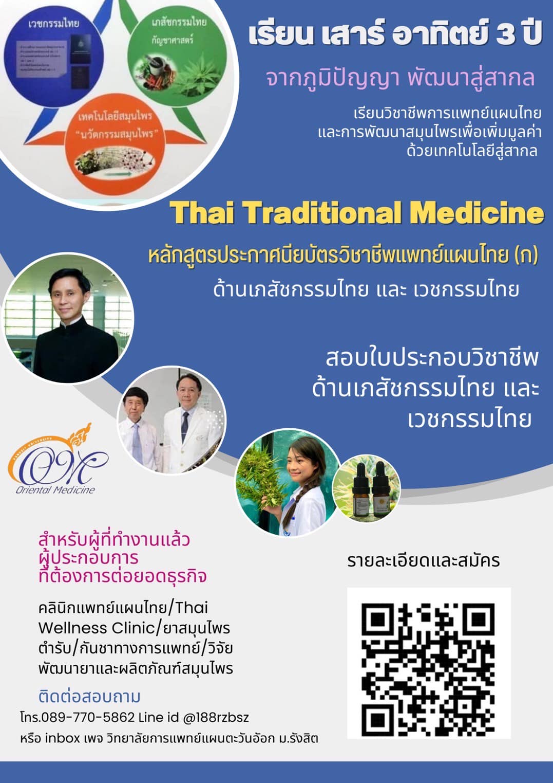 EZ Webmaster July 17, 2023 EZ Webmaster July 17, 2023 ม.รังสิต เปิดโอกาสให้เป็นแพทย์แผนไทยได้ ไม่จำกัดอายุและการศึกษา เรียนเฉพาะเสาร์-อาทิตย์ 3 ปี วิทยาลัยการแพทย์แผนตะวันออก มหาวิทยาลัยรังสิต ได้ถูกก่อตั้งมาตั้งแต่ปี 2545 โดยเป็นวิสัยทัศน์ของ ดร.อาทิตย์ อุไรรัตน์ อธิการบดีผู้ก่อตั้งมหาวิทยาลัยรังสิต ปัจจุบันได้รับการสานต่อมาถึง ดร.อรรถวิท อุไรรัตน์ อธิการบดีคนปัจจุบัน โดยนับตั้งแต่การเกิดโรคระบาดในรอบหลายปีที่ผ่านมา ได้มีความชัดเจนมากว่าภูมิปัญญาของโลกตะวันออกได้มีความสำคัญมากขึ้น โดยเฉพาะการพึ่งพาตัวเองด้วยสมุนไพรได้มาก โดยการแพทย์แผนตะวันออกที่ได้รับความสนใจและมีงานวิจัยที่พัฒนาเพิ่มขึ้นในเวทีโลกทั้งการแพทย์แผนจีน การแพทย์อายุรเวทอินเดีย โดยเฉพาะในประเทศไทย ทั้งการแพทย์แผนไทย การแพทย์แผนไทยประยุกต์ หมอพื้นบ้าน รวมถึงการพึ่งพาตัวเองของชาวบ้านด้วยสมุนไพรได้มีบทบาทมากขึ้นเป็นลำดับ จากข้อมูลของ Euromonitor พบว่า การค้าปลีกผลิตภัณฑ์สมุนไพรทั่วโลกในปี พ.ศ. 2564 มีมูลค่า 54,960 ล้านเหรียญสหรัฐฯ (ประมาณ 1.9 ล้านล้านบาท) โดยภูมิภาคเอเชียแปซิฟิก มีมูลค่าการค้าปลีกผลิตภัณฑ์สมุนไพรสูงที่สุด เป็นอันดับ 1 มีมูลค่าสูงถึง 31,930 พันล้านเหรียญสหรัฐฯ (ประมาณ 1.1 ล้านล้านบาท) ตลาดของผลิตภัณฑ์สมุนไพรในประเทศไทย ในปี พ.ศ. 2564 มีมูลค่าสูงถึง 45,640 ล้านบาท นอกจากนั้นประเทศไทยมีการ “ส่งออกวัตถุดิบสมุนไพรคุณภาพและผลิตภัณฑ์สมุนไพร” เป็นอันดับ 1 ในภูมิภาคเอเชียตะวันออกเฉียงใต้ หรือคิดเป็นมูลค่าทั้งสิ้นกว่า 12,211 ล้านบาท และกำลังเติบโตอย่างต่อเนื่อง โดยคาดการณ์ว่าในปี พ.ศ. 2569 มูลค่าตลาดสมุนไพรในประเทศไทยจะมีมูลค่ามากถึง 59,500 ล้านบาท โดยเฉพาะตลาดผลิตภัณฑ์กัญชากัญชงนั้น สมาคมสหอุตสาหกรรมพืชกัญชงและกัญชาเพียงสมาคมเดียว ซึ่งมีผู้ประกอบการรวมตัวกัน 20 แห่ง มีการลงทุนไปแล้วกว่า 10,000 ล้านบาท และยังมีสมาคมที่เกี่ยวข้องกับผู้ประกอบการอีกหลายแห่งที่เดินหน้าในการลงทุนเรื่องกัญชากัญชงไปแล้วอีกจำนวนมาก และเนื่องจากทิศทางตลาดกัญชากัญชงได้มีการยอมรับการใช้ทางการแพทย์มากขึ้น บทบาทของผู้ที่จะจ่ายยากัญชาในหมู่แพทย์แผนปัจจุบันที่บูรณาการภูมิปัญญาสมุนไพรอยู่ในวงจำกัดเพียงไม่กี่คน โดยการจ่ายยากัญชาทางการแพทย์ในระบบสาธารณสุขที่ผ่านมาในประเทศไทยจึงกลายเป็นบทบาทของการแพทย์แผนไทย การแพทย์แผนไทยประยุกต์ หมอพื้นบ้าน การแพทย์แผนจีน ให้กับประชาชนในประเทศไทยมากที่สุด ด้วยสถานการณ์ที่มีความต้องการแพทย์แผนตะวันออกมากขึ้น วิทยาลัยการแพทย์แผนตะวันออก มหาวิทยาลัยรังส