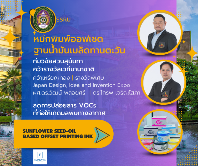 tui sakrapee July 25, 2023 tui sakrapee July 25, 2023 “หมึกพิมพ์ออฟเซตฐานน้ำมันเมล็ดทานตะวัน” ทีมวิจัยสวนสุนันทาคว้ารางวัลเวทีนานาชาติ นักวิจัยมหาวิทยาลัยราชภัฏสวนสุนันทา โดย ผู้ช่วยศาสตราจารย์ ดร.วัฒน์ พลอยศรี และอาจารย์ ดร.ไกรพ เจริญโสภา คณะเทคโนโลยีอุตสาหกรรม นำผลงานวิจัย “หมึกพิมพ์ออฟเซตฐานน้ำมันเมล็ดทานตะวัน” ซึ่งได้รับการคัดเลือกจากสำนักงานการวิจัยแห่งชาติ (วช.) เข้าร่วมประกวดและจัดแสดงผลงาน เมื่อวันที่ 8 กรกฎาคม 2566 ณ Tokyo Ariake Garden Convention Center, Japan กรุงโตเกียว ประเทศญี่ปุ่น ผลงานปรากฏว่าทีมนักวิจัยของมหาวิทยาลัยราชภัฏสวนสุนันทาสามารถคว้ารางวัลเหรียญทองและรางวัลพิเศษ ในเวที “Japan Design, Idea and Invention Expo” (JDIE 2023) ทีมวิจัย โดยผู้ช่วยศาสตราจารย์ ดร.วัฒน์ พลอยศรี และอ.ดร.ไกรพ เจริญโสภา อาจารย์ประจำสาขาวิชาอุตสาหกรรมศิลป์และวิทยาศาสตร์ คณะเทคโนโลยีอุตสาหกรรม กล่าวว่า ผลงาน “หมึกพิมพ์ออฟเซตฐานน้ำมันเมล็ดทานตะวัน : SUNFLOWER SEED-OIL-BASED OFFSET PRINTING INK” เป็นหมึกพิมพ์ระบบการพิมพ์ออฟเซตที่มีผลการทดสอบสมบัติพบว่าหมึกพิมพ์ให้สีที่เข้มขึ้น มีเวลาในการหมาดตัวที่สั้นกว่า การแห้งตัวเร็วกว่าหมึกพิมพ์น้ำมันมะพร้าว จึงผลิตสิ่งพิมพ์ด้วยความเร็วสูงได้ สามารถผลิตสิ่งพิมพ์ที่มีคุณภาพเป็นที่ยอมรับของลูกค้า และเป็นมิตรกับสิ่งแวดล้อมเนื่องจากน้ำมันเมล็ดทานตะวันจากการสกัดเย็นถูกนำมาใช้เพื่อลดปริมาตรน้ำมันปิโตรเลียมในการผลิต จึงช่วยลดการปล่อยสาร VOCs ที่ก่อให้เกิดมลพิษทางอากาศและอันตรายต่อช่างพิมพ์ ส่งผลดีในเรื่องของการสร้างเสริมสุขภาพที่ดีและสิ่งแวดล้อม สำหรับผลงานนวัตกรรมนี้นับเป็นการส่งเสริมการพัฒนาอุตสาหกรรมและนวัตกรรมที่ยั่งยืน อีกทั้งยังเป็นการใช้วัสดุจากธรรมชาติในการสร้างมูลค่าเพิ่มให้สินค้าเศรษฐกิจระดับชาติอีกด้วย ซึ่งเป็นไปตามนโยบายเป้าหมายการพัฒนาอย่างยั่งยืน (Sustainable Development Goals : SDGs) โดยสอดคล้องกับ SDGs เป้าหมายที่ 9 สร้างโครงสร้างพื้นฐานที่มีความยืดหยุ่นต่อการเปลี่ยนแปลง ส่งเสริมการพัฒนาอุตสาหกรรม ที่ครอบคลุมและยั่งยืน และส่งเสริมนวัตกรรม เป้าหมายที่ 12 สร้างหลักประกันให้มีแบบแผนการผลิตและการบริโภคที่ยั่งยืน เป้าหมายที่ 13 ปฏิบัติการอย่างเร่งด่วนเพื่อต่อสู้กับการเปลี่ยนแปลงสภาพภูมิอากาศ และผลกระทบที่เกิดขึ้น และเป้าหมายที่ 17 เสริมความแข็งแกร่งให้แก่กลไกการดำเนินงานและฟื้นฟูหุ้นส่วนความร่วมมือระดับโลก เพื่อการพัฒนาที่ยั่งยืน