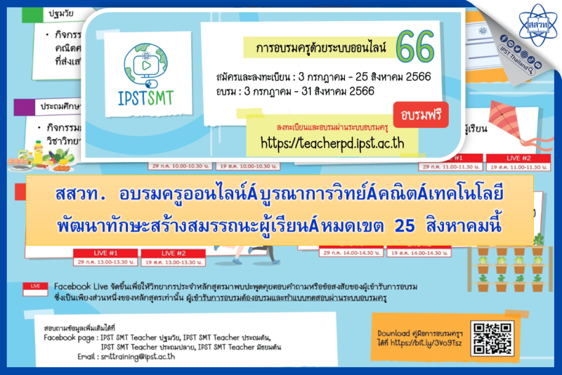 สถาบันส่งเสริมการสอนวิทยาศาสตร์และเทคโนโลยี (สสวท.) ชวนคุณครูเติมเต็มความรู้กับการอบรมครูด้วยระบบออนไลน์ ประจำปี 2566 พบกับหลักสูตรใหม่ปีนี้ได้แก่ กิจกรรมการเรียนรู้บูรณาการวิทยาศาสตร์ คณิตศาสตร์ เทคโนโลยีและสะเต็มศึกษาที่ส่งเสริมสมรรถนะผู้เรียน เรื่อง สวนสนุกกับแรงหรรษา ระดับปฐมวัย กิจกรรมการเรียนรู้ที่ส่งเสริมสมรรถนะผู้เรียนวิชาวิทยาศาสตร์และเทคโนโลยี เรื่อง รังสรรค์เมนูคู่ใจ ระดับประถมศึกษา กิจกรรมการเรียนรู้ที่ส่งเสริมสมรรถนะผู้เรียนวิชาคณิตศาสตร์เรื่อง กระชับพื้นที่ ระดับประถมศึกษา กิจกรรมการเรียนรู้ที่ส่งเสริมสมรรถนะผู้เรียนวิชาวิทยาศาสตร์และเทคโนโลยี เรื่อง วิ่งให้สนุก สุขภาพแข็งแรง ระดับมัธยมศึกษาตอนต้น กิจกรรมการเรียนรู้บูรณาการคณิตศาสตร์และเทคโนโลยีที่ส่งเสริมสมรรถนะผู้เรียน เรื่องสวนผักแนวตั้ง ระดับมัธยมศึกษาตอนต้น อบรมฟรี สมัครได้จนถึง 25 สิงหาคม 2566 ที่ระบบอบรมครู https://teacherpd.ipst.ac.th สามารถอบรมได้จนถึง 31 สิงหาคมนี้ สอบถามที่เฟซบุ๊ก IPST SMT Teacher ปฐมวัย IPST SMT Teacher ประถมต้น IPST SMT Teacher ประถมปลาย IPST SMT Teacher มัธยมต้น หรือที่อีเมล smttraining@ipst.ac.th