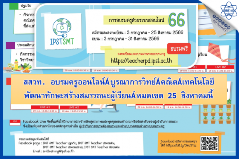 EZ Webmaster July 27, 2023 สสวท. อบรมครูออนไลน์ บูรณาการวิทย์ คณิต เทคโนโลยี พัฒนาทักษะสร้างสมรรถนะผู้เรียน หมดเขต 25 สิงหาคมนี้ EZ Webmaster July 27, 2023 สถาบันส่งเสริมการสอนวิทยาศาสตร์และเทคโนโลยี (สสวท.) ชวนคุณครูเติมเต็มความรู้กับการอบรมครูด้วยระบบออนไลน์ ประจำปี 2566 พบกับหลักสูตรใหม่ปีนี้ได้แก่ กิจกรรมการเรียนรู้บูรณาการวิทยาศาสตร์ คณิตศาสตร์ เทคโนโลยีและสะเต็มศึกษาที่ส่งเสริมสมรรถนะผู้เรียน เรื่อง สวนสนุกกับแรงหรรษา ระดับปฐมวัย กิจกรรมการเรียนรู้ที่ส่งเสริมสมรรถนะผู้เรียนวิชาวิทยาศาสตร์และเทคโนโลยี เรื่อง รังสรรค์เมนูคู่ใจ ระดับประถมศึกษา กิจกรรมการเรียนรู้ที่ส่งเสริมสมรรถนะผู้เรียนวิชาคณิตศาสตร์เรื่อง กระชับพื้นที่ ระดับประถมศึกษา กิจกรรมการเรียนรู้ที่ส่งเสริมสมรรถนะผู้เรียนวิชาวิทยาศาสตร์และเทคโนโลยี เรื่อง วิ่งให้สนุก สุขภาพแข็งแรง ระดับมัธยมศึกษาตอนต้น กิจกรรมการเรียนรู้บูรณาการคณิตศาสตร์และเทคโนโลยีที่ส่งเสริมสมรรถนะผู้เรียน เรื่องสวนผักแนวตั้ง ระดับมัธยมศึกษาตอนต้น อบรมฟรี สมัครได้จนถึง 25 สิงหาคม 2566 ที่ระบบอบรมครู https://teacherpd.ipst.ac.th สามารถอบรมได้จนถึง 31 สิงหาคมนี้ สอบถามที่เฟซบุ๊ก IPST SMT Teacher ปฐมวัย IPST SMT Teacher ประถมต้น IPST SMT Teacher ประถมปลาย IPST SMT Teacher มัธยมต้น หรือที่อีเมล smttraining@ipst.ac.th Continue Reading