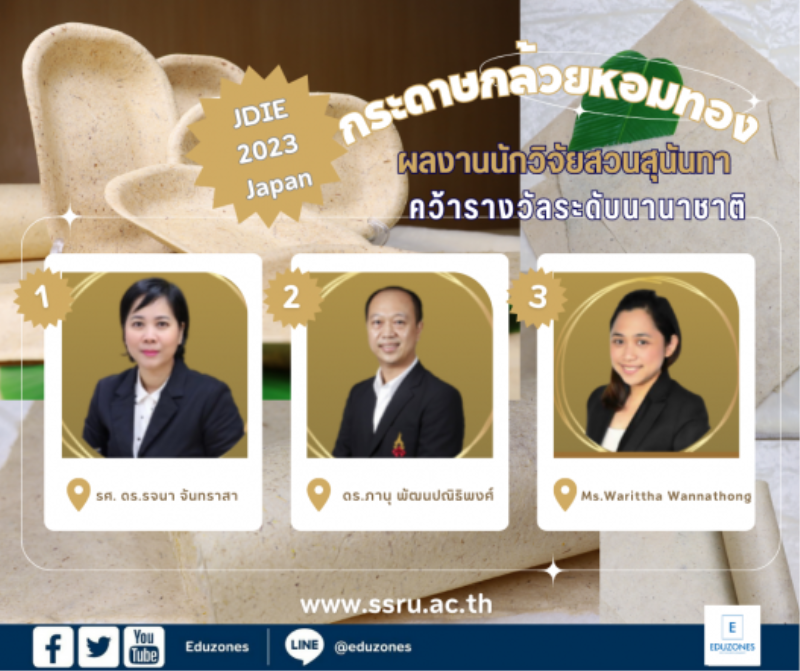 tui sakrapee July 20, 2023 “กระดาษกล้วยหอมทอง” ผลงานนักวิจัยสวนสุนันทา คว้ารางวัลระดับนานาชาติ งานประกวด JDIE 2023 ประเทศญี่ปุ่น tui sakrapee July 20, 2023 ผลงาน “กระดาษกล้วยหอมทอง” นักวิจัยสวนสุนันทา คว้ารางวัลระดับนานาชาติ ในงานประกวดผลงานวิจัย สิ่งประดิษฐ์ และนวัตกรรม JDIE 2023 ประเทศญี่ปุ่น อาจารย์ ดร.ภานุ พัฒนปณิธิพงศ์ รองศาสตราจารย์ ดร.รจนา จันทราสา อาจารย์ประจำแขนงวิชาการออกแบบสินค้าไลฟ์สไตล์ สาขาวิชาการออกแบบแฟชั่นและสินค้าไลฟ์สไตล์ คณะศิลปกรรมศาสตร์ มหาวิทยาลัยราชภัฏสวนสุนันทา และMs.Warittha Wannathong, Urban Governance Specialist, Asian Disaster Preparedness Center นำผลงานวิจัย “กระดาษกล้วยหอมทอง :… Continue Reading