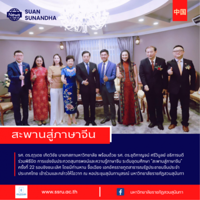 tui sakrapee August 1, 2023 “สะพานสู่ภาษาจีน” ครั้งที่ 22 รอบชิงชนะเลิศ ผู้บริหารสวนสุนันทาพร้อมเอกอัครราชทูตหาน จื้อ เฉียง ร่วมพิธีปิดคึกคัก tui sakrapee August 1, 2023 วันที่ 30 กรกฏาคม 2566 มหาวิทยาลัยราชภัฏสวนสุนันทา โดย รองศาสตราจารย์ ดร.ฤๅเดช เกิดวิชัย นายกสภามหาวิทยาลัย พร้อมด้วย รองศาสตราจารย์ ดร.ชุติกาญจน์ ศรีวิบูลย์ อธิการบดี ร่วมพิธีปิด การแข่งขันประกวดสุนทรพจน์และความรู้ภาษาจีน ระดับอุดมศึกษา “สะพานสู่ภาษาจีน” ครั้งที่ 22 รอบชิงชนะเลิศ โดยมีท่านหาน จื้อเฉียง เอกอัครราชทูตสาธารณรัฐประชาชนจีนประจำประเทศไทย เข้าร่วมและกล่าวให้โอวาท ณ หอประชุมสุนันทานุสรณ์ มหาวิทยาลัยราชภัฏสวนสุนันทา . . Continue Reading