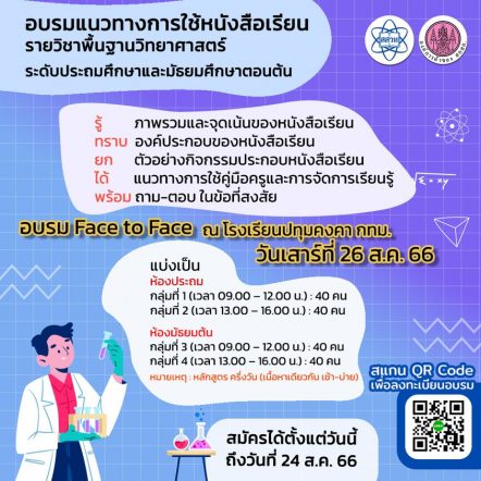 EZ Webmaster August 22, 2023 สสวท. จับมือองค์การค้า สกสค. อบรมครูแนวทางการใช้หนังสือเรียนวิทยาศาสตร์ สมัครได้ถึง 24 ส.ค.นี้ รับจำนวนจำกัด EZ Webmaster August 22, 2023 สถาบันส่งเสริมการสอนวิทยาศาสตร์และเทคโนโลยี (สสวท.) ร่วมกับองค์การค้าของ สกสค. จัดอบรมครูวิทยาศาสตร์ แนวทางการใช้หนังสือเรียนรายวิชาพื้นฐานวิทยาศาสตร์ระดับประถมศึกษาถึงมัธยมศึกษาตอนต้น เพิ่มความเข้าใจแนวทางการจัดการเรียนรู้ผ่านกระบวนการเรียนรู้เชิงรุก สมรรถนะที่สอดแทรกในหนังสือเรียน แนวทางการใช้คู่มือครู และ ภาพรวม/จุดเน้นของหนังสือเรียนรายวิชาพื้นฐาน สมัครได้ถึง 24 สิงหาคม 2566อบรมวันเสาร์ที่ 26 สิงหาคม 2566 อบรม on-site ฟรี ระดับประถมศึกษารอบเช้า/รอบบ่าย มัธยมศึกษา รอบเช้า/รอบบ่าย ที่โรงเรียนปทุมคงคา ใกล้รถไฟฟ้า BTS สถานีเอกมัย รับจำนวนจำกัด สมัครที่ https://ssp3.i-styles.co/th/training/ipst Continue Reading
