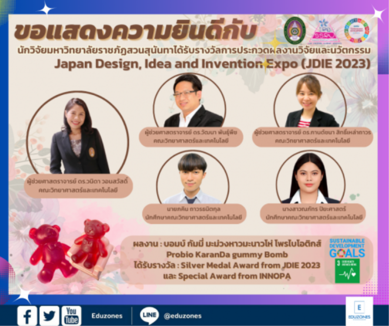 tui sakrapee August 21, 2023 “ผลงาน บอมบ์ กัมมี่ มะม่วงหาวมะนาวโห่ โพรไบโอติกส์” ทีมนักวิจัย – นักศึกษาสวนสุนันทา คว้าเหรียญเงินจากญี่ปุ่น tui sakrapee August 21, 2023 ทีมนักวิจัย – นักศึกษาสวนสุนันทา สร้างชื่อคว้ารางวัลเหรียญเงิน “ผลงาน บอมบ์ กัมมี่ มะม่วงหาวมะนาวโห่ โพรไบโอติกส์” นักวิจัยและนักศึกษาคณะวิทยาศาสตร์และเทคโนโลยี มหาวิทยาลัยราชภัฏสวนสุนันทา ได้แก่ ผู้ช่วยศาสตราจารย์ ดร.วนิดา วอนสวัสดิ์ ผู้ช่วยศาสตราจารย์ ดร.วัฒนา พันธุ์พืช ผู้ช่วยศาสตราจารย์ ดร.กานต์ชนา สิทธิ์เหล่าถาวร นายภคิน ถาวรธนิตกุล นางสาวณภัทร ปิยะศาสตร์ คว้ารางวัลเหรียญเงินและรางวัลพิเศษ (Special Award from INNOPA) จากผลงาน “บอมบ์… Continue Reading