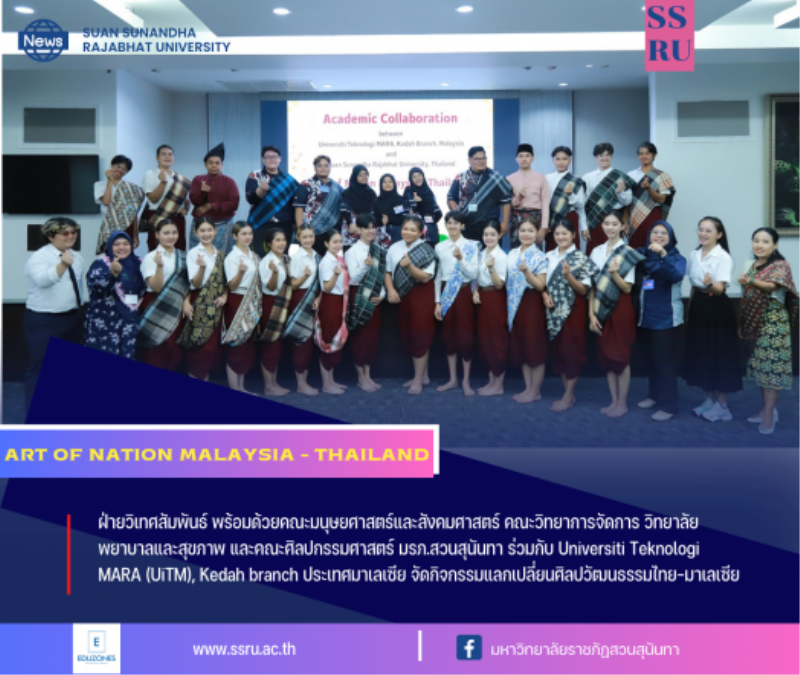 tui sakrapee August 18, 2023 สวนสุนันทา ร่วมกับ UiTM จัดกิจกรรมแลกเปลี่ยนศิลปวัฒนธรรมไทย-มาเลเซีย tui sakrapee August 18, 2023 สวนสุนันทา ร่วมกับ UiTM จัดกิจกรรมแลกเปลี่ยนศิลปวัฒนธรรมไทย-มาเลเซีย “ART OF NATION MALAYSIA – THAILAND” วันที่ 17 สิงหาคม 2566 – ฝ่ายวิเทศสัมพันธ์ พร้อมด้วยคณะมนุษยศาสตร์และสังคมศาสตร์ คณะวิทยาการจัดการ วิทยาลัยพยาบาลและสุขภาพ และคณะศิลปกรรมศาสตร์ ร่วมกับ Universiti Teknologi MARA (UiTM), Kedah branch ประเทศมาเลเซีย จัดกิจกรรมแลกเปลี่ยนศิลปวัฒนธรรมไทย-มาเลเซีย “ART OF NATION… Continue Reading