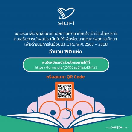 EZ Webmaster August 18, 2023 สมศ. ผนึกกำลังกับภาคีเครือข่ายขับเคลื่อน “โครงการส่งเสริมการนำผลประเมินไปใช้” ชวนสถานศึกษาเข้าร่วมโครงการ มุ่งยกระดับคุณภาพสถานศึกษา พร้อมก้าวทันการเปลี่ยนแปลงอย่างเข้มแข็ง EZ Webmaster August 18, 2023 สมศ. ผนึกกำลังกับภาคีเครือข่ายสถาบันอุดมศึกษา 27 แห่ง ในนาม “ศูนย์ประสานงาน สมศ.”ผู้ทรงคุณวุฒิที่มีความเชี่ยวชาญ และหน่วยงานต้นสังกัดของสถานศึกษา ร่วมขับเคลื่อนโครงการส่งเสริมการนำผลการประเมินคุณภาพภายนอกไปใช้พัฒนาคุณภาพสถานศึกษา ให้กับสถานศึกษาจำนวน 133 แห่ง ในปีงบประมาณ พ.ศ. 2564 – 2566 โดยการนำประเด็นข้อเสนอแนะที่ได้จากรายงานการประเมินคุณภาพภายนอกของสถานศึกษามาวิเคราะห์ พร้อมจัดทำเป็นแผนพัฒนาคุณภาพสถานศึกษาในระยะสั้นและระยะยาว โดยไม่สร้างภาระเพิ่มเติมแก่สถานศึกษา พร้อมเปิดรับสมัครสถานศึกษาจำนวน 150 แห่งที่สนใจเข้าร่วม “โครงการส่งเสริมการนำผลประเมินไปใช้เพื่อพัฒนาคุณภาพสถานศึกษา” ในปีงบประมาณ พ.ศ. 2567 – 2568 ดร. นันทา หงวนตัด… Continue Reading
