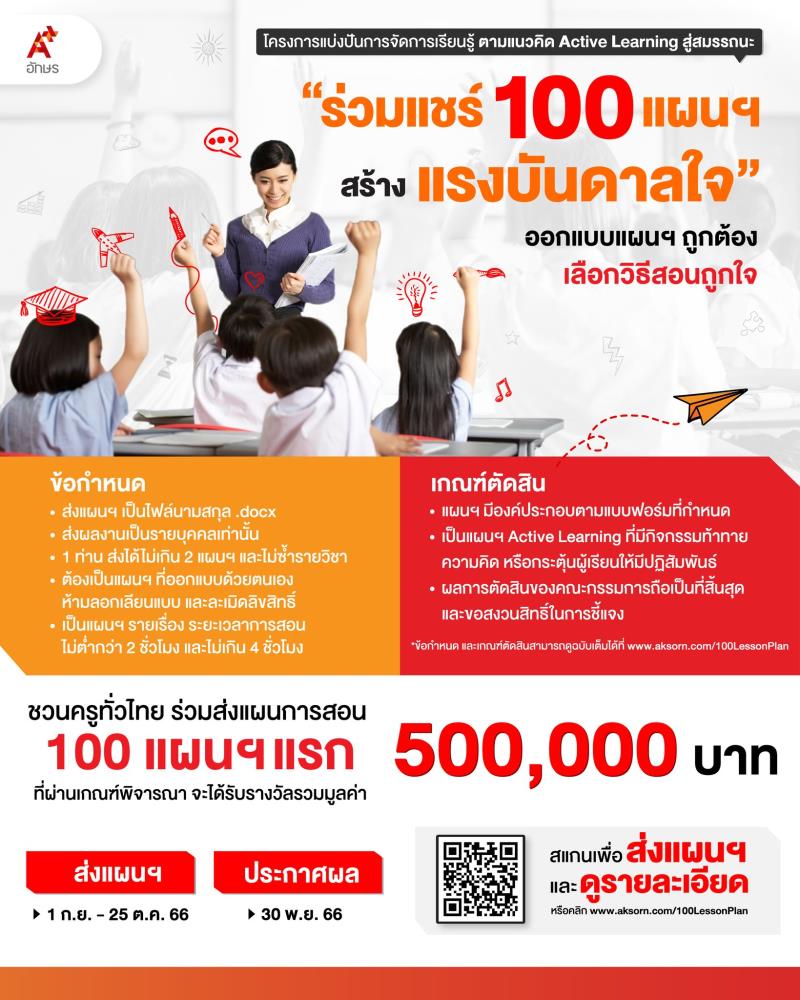EZ Webmaster September 12, 2023 EZ Webmaster September 12, 2023 โครงการแบ่งปันการจัดการเรียนรู้ตามแนวคิด Active Learning สู่สมรรถนะ “ร่วมแชร์ 100 แผนฯ สร้างแรงบันดาลใจ” มีของดีต้องแชร์! คุณครูท่านไหนคิดว่าตัวเองมีแผนการจัดการเรียนรู้ดี เปลี่ยนห้องเรียนธรรมดา ให้มีชีวิตชีวามากกว่าเดิม อย่าเก็บแผนฯ นั้นไว้คนเดียว มาร่วมแชร์แผนฯ นั้นไปกับเรา . โครงการแบ่งปันการจัดการเรียนรู้ตามแนวคิด Active Learning สู่สมรรถนะ “ร่วมแชร์ 100 แผนฯ สร้างแรงบันดาลใจ” . เปิดให้คุณครูทั่วไทยร่วมแบ่งปันแผนการจัดการเรียนรู้ที่ใช้ได้จริง สอนแล้วได้ผลจริง ไม่เลียนแบบ และละเมิดลิขสิทธิ์ . โดย 100 แผนฯ แรกที่ได้รับการคัดเลือกตามเกณฑ์การพิจารณาตัดสิน จะได้รับรางวัลรวมมูลค่ากว่า 500,000 บาท พร้อมใบประกาศเกียรติคุณ . ส่งผลงานได้ตั้งแต่ 1 ก.ย. – 25 ต.ค. 2566 ประกาศผล 30 พ.ย. 2566 ศึกษาข้อมูล และส่งแผนฯ ได้ที่ www.aksorn.com/100LessonPlan . เพียงหนึ่งแผนการจัดการเรียนรู้ ก็สามารถสร้างแรงบันดาลใจให้คุณครูได้ทั่วไทย! . ข้อมูลเพิ่มเติมได้ที่ ฝ่ายอบรมและกิจกรรมพิเศษ โทร. 097-281-9905 / 086-341-8002 https://www.facebook.com/AksornACT/posts/pfbid0PtfYGhhwXLjLg2uVHWPHxFHNmxZTeMuVM1th4zFdHQsqBWrdftG89MoCbASRqJBql . #อักษร #Aksorn