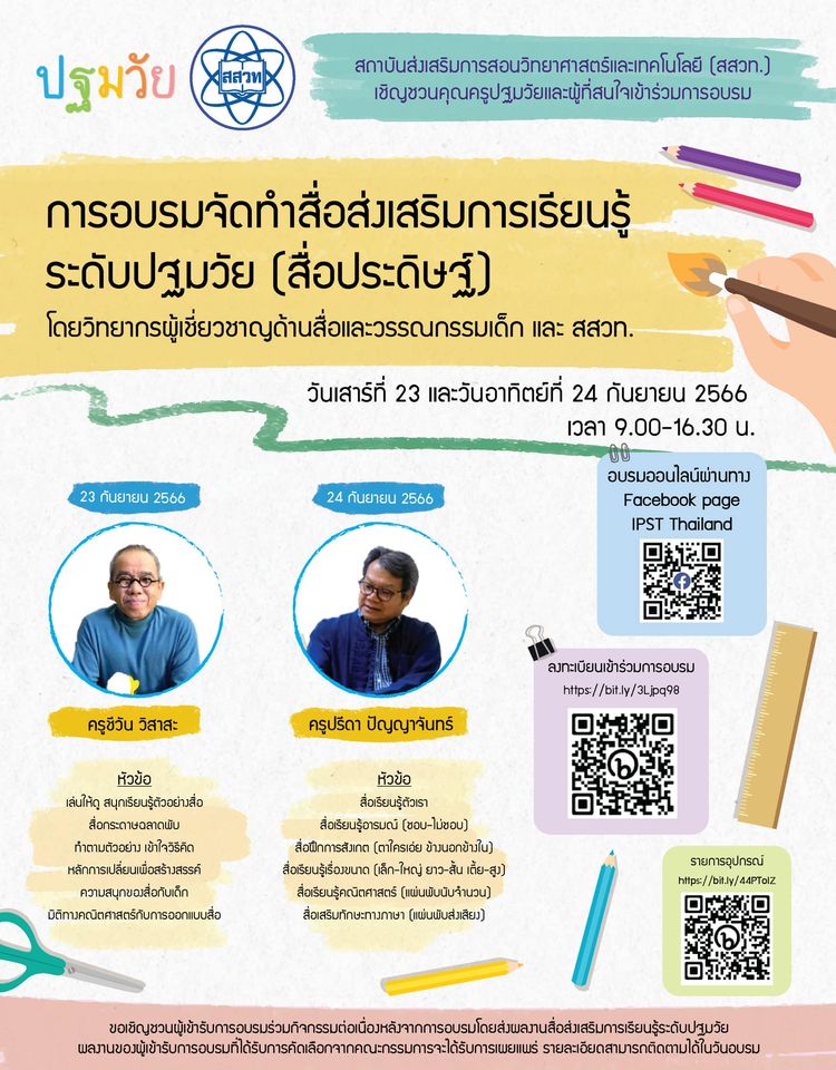 EZ Webmaster September 19, 2023 EZ Webmaster September 19, 2023 สสวท. เชิญครูอบรมฟรี “การจัดทำสื่อส่งเสริมการเรียนรู้ระดับปฐมวัย (สื่อประดิษฐ์)” สถาบันส่งเสริมการสอนวิทยาศาสตร์และเทคโนโลยี (สสวท.) เชิญคุณครูปฐมวัยและผู้สนใจอบรมฟรี “การจัดทำสื่อส่งเสริมการเรียนรู้ระดับปฐมวัย (สื่อประดิษฐ์)”โดยผู้เชี่ยวชาญด้านสื่อและวรรณกรรมเด็ก วันเสาร์ที่ 23 และวันอาทิตย์ที่ 24 กันยายน 2566 เวลา 09.00 -16.30 น.อบรมออนไลน์ผ่านเฟซบุ๊กเพจ IPST Thailand ที่ https://www.facebook.com/ipst.thai ลงทะเบียนสมัครได้ที่ https://bit.ly/3Ljpq98 ผู้เข้าอบรมดาวน์โหลดอุปกรณ์ประกอบการอบรมที่ https://bit.ly/44PToIZ สอบถามที่เฟซบุ๊ก ปฐมวัย สสวท. https://facebook.com/ipst.earlychildhood