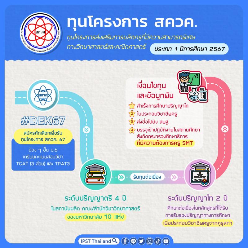 EZ Webmaster September 28, 2023 EZ Webmaster September 28, 2023 สสวท. รับสมัครทุนโครงการส่งเสริมการผลิตครูที่มีความสามารถพิเศษ ทางวิทยาศาสตร์และคณิตศาสตร์ (สควค.) ระดับปริญญาตรี – โท สถาบันส่งเสริมการสอนวิทยาศาสตร์และเทคโนโลยี (สสวท.) รับสมัครคัดเลือกผู้รับทุนโครงการส่งเสริมการผลิตครูที่มีความสามารถพิเศษทางวิทยาศาสตร์และคณิตศาสตร์ (สควค.) ระยะที่ 4 ประเภท 1 ระดับปริญญาตรี – โท ประจำปีการศึกษา 2567 จำนวน 75 ทุน ผู้สนใจต้องกำลังศึกษาระดับมัธยมศึกษาปีที่ 6 ในปีการศึกษา 2566 มีคะแนน ผลการเรียนรวม 5 ภาคการศึกษา นับตั้งแต่ชั้นมัธยมศึกษาปีที่ 4 มีผลการเรียนเฉลี่ยทุกวิชารวมกันไม่น้อยกว่า 3.00 ผลการเรียน เฉลี่ยวิชาวิทยาศาสตร์และวิชาคณิตศาสตร์รวมกันไม่น้อยกว่า 3.25 คุณสมบัติและรายละเอียดดูที่ ประกาศการคัดเลือกผู้รับทุนโครงการ สควค. ระยะที่ 4 ประเภท 1 ระดับปริญญาตรี-โท ประจำปีการศึกษา 2567 เว็บไซต์โครงการ สควค.www.ipst.ac.th/unit–psmt อีเมล psmt@ipst.ac.th