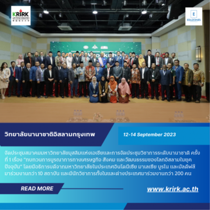 tui sakrapee September 14, 2023 วิทยาลัยนานาชาติอิสลามกรุงเทพ จัดใหญ่ ประชุมสมาคมมหาวิทยาลัยมุสลิมแห่งเอเชียพร้อมประชุมวิชาการระดับนานาชาติ ครั้งที่ 1 tui sakrapee September 14, 2023 วิทยาลัยนานาชาติอิสลามกรุงเทพ จัดใหญ่ ประชุมสมาคมมหาวิทยาลัยมุสลิมแห่งเอเชียและการจัดประชุมวิชาการระดับนานาชาติ ครั้งที่ 1 “ทบทวนการบูรณาการทางเศรษฐกิจ สังคม และวัฒนธรรมของโลกอิสลามในยุคปัจจุบัน” ศ.ดร. นายแพทย์กระแส ชนะวงศ์ อธิการบดีมหาวิทยาลัยเกริก เป็นประธานเปิดงาน ประชุมสมาคมมหาวิทยาลัยมุสลิมแห่งเอเชียและการจัดประชุมวิชาการระดับนานาชาติ ครั้งที่ 1 เรื่อง “ทบทวนการบูรณาการทางเศรษฐกิจ สังคม และวัฒนธรรมของโลกอิสลามในยุคปัจจุบัน” โดยมีอธิการบดีจากมหาวิทยาลัยในประเทศอินโดนีเซีย มาเลเซีย บูรไน และมัลดีฟส์ มาร่วมงานกว่า 10 สถาบัน และมีนักวิชาการทั้งในและต่างประเทศมาร่วมงานกว่า 200 คน ณ ห้องประชุมวิชาการนานาชาติ… Continue Reading