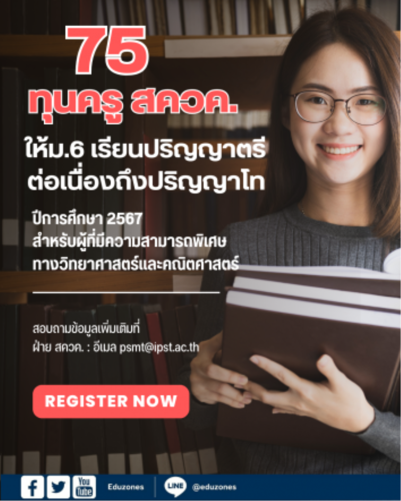tui sakrapee September 25, 2023 75 ทุนครู สควค. ให้ม.6 เรียนปริญญาตรีต่อเนื่องถึงป.โท ปี 2567 tui sakrapee September 25, 2023 . สถาบันส่งเสริมการสอนวิทยาศาสตร์และเทคโนโลยี (สสวท.) ประกาศรับสมัครคัดเลือกผู้รับทุนโครงการส่งเสริมการผลิตครูที่มีความสามารถพิเศษทางวิทยาศาสตร์และคณิตศาสตร์ (สควค.) ระยะที่ 4 ประเภท 1 ระดับปริญญาตรี-โท (รับทุนต่อเนื่อง) ประจำปีการศึกษา 2567 ตามมติคณะรัฐมนตรี ทุนโครงการ สควค. ประเภท 1 ให้ศึกษาระดับปริญญาตรีต่อเนื่องระดับปริญญาโท รวมระยะเวลา 6 ปี โดยเริ่มเรียนหลักสูตรวิทยาศาสตรบัณฑิต (วท.บ.) 4 ปีแรก ในสาขาวิชาคณิตศาสตร์ วิทยาการคอมพิวเตอร์ ชีววิทยา เคมี หรือฟิสิกส์ ภายใต้คณะวิทยาศาสตร์หรือสำนักวิชาวิทยาศาสตร์… Continue Reading