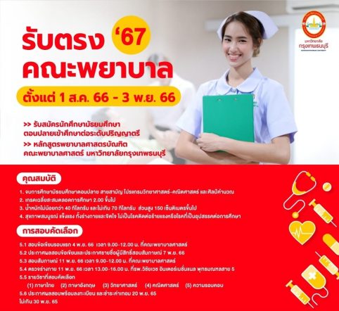 tui sakrapee September 22, 2023 มหาวิทยาลัยกรุงเทพธนบุรี รับตรง ปี 67 คณะพยาบาลศาสตร์ tui sakrapee September 22, 2023 มหาวิทยาลัยกรุงเทพธนบุรี รับตรง 67 คณะพยาบาล รับสมัครนักศึกษามัธยมศึกษา ตอนปลายเข้าศึกษาต่อระดับปริญญาตรี หลักสูตรพยาบาลศาสตรบัณฑิต คณะพยาบาลศาสตร์ มหาวิทยาลัยกรุงเทพธนบุรี กำหนดการรับสมัคร สมัครได้ตั้งแต่วันนี้ – 3 พ.ย. 66 คุณสมบัติ 1. จบการศึกษามัธยมศึกษาตอนปลาย สายสามัญ โปรแกรมวิทยาศาสตร์-คณิตศาสตร์ และศิลป์คําานวณ 2. เกรดเฉลี่ยสะสมตลอดการศึกษา 2.00 ขึ้นไป 3. นํ้าหนักไม่น้อยกว่า 40 กิโลกรัม และไม่เกิน 70 กิโลกรัม… Continue Reading