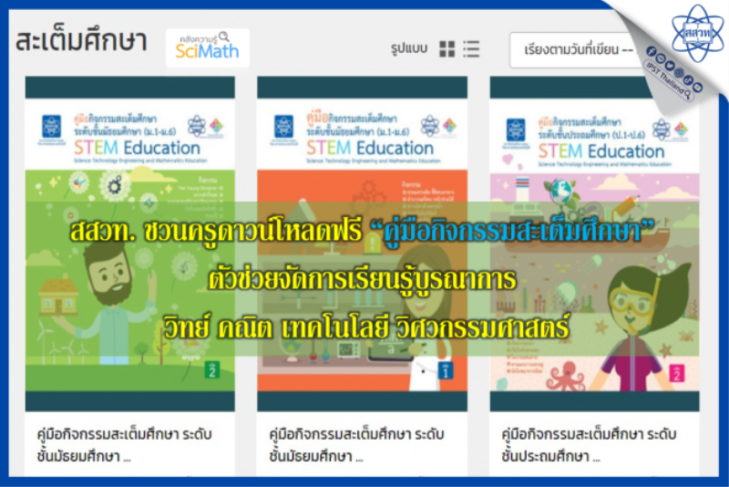EZ Webmaster September 21, 2023 สสวท. ชวนครูดาวน์โหลดฟรี “คู่มือกิจกรรมสะเต็มศึกษา” ตัวช่วยจัดการเรียนรู้บูรณาการ วิทย์ คณิต เทคโนโลยี วิศวกรรมศาสตร์ EZ Webmaster September 21, 2023 สถาบันส่งเสริมการสอนวิทยาศาสตร์และเทคโนโลยี (สสวท.) ชวนคุณครูดาวน์โหลดฟรี คู่มือกิจกรรมสะเต็มศึกษาระดับประถมศึกษาและมัธยมศึกษา จัดทำขึ้นเพื่อเป็นแนวทางให้โรงเรียนใช้ในการจัดการเรียนการสอนโดยบูรณาการความรู้วิทยาศาสตร์ เทคโนโลยี วิศวกรรมศาสตร์ และคณิตศาสตร์ ในรูปแบบของกิจกรรมตามศักยภาพและพัฒนาการของผู้เรียน ประกอบด้วยกิจกรรมส่งเสริมการเรียนรู้หลากหลายหัวเรื่อง เพื่อให้ผู้เรียนสามารถนำความรู้และทักษะต่าง ๆ ไปใช้ในการทำกิจกรรมที่สอดคล้องและเหมาะสมกับวัยได้ต่อไป ดาวน์โหลดใช้งานฟรีได้ที่ คลังความรู้ SciMath สสวท. https://www.scimath.org/ebook-stem Continue Reading