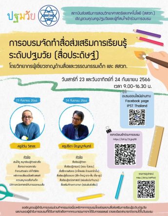 EZ Webmaster September 19, 2023 สสวท. เชิญครูอบรมฟรี “การจัดทำสื่อส่งเสริมการเรียนรู้ระดับปฐมวัย (สื่อประดิษฐ์)” EZ Webmaster September 19, 2023 สถาบันส่งเสริมการสอนวิทยาศาสตร์และเทคโนโลยี (สสวท.) เชิญคุณครูปฐมวัยและผู้สนใจอบรมฟรี “การจัดทำสื่อส่งเสริมการเรียนรู้ระดับปฐมวัย (สื่อประดิษฐ์)”โดยผู้เชี่ยวชาญด้านสื่อและวรรณกรรมเด็ก วันเสาร์ที่ 23 และวันอาทิตย์ที่ 24 กันยายน 2566 เวลา 09.00 -16.30 น.อบรมออนไลน์ผ่านเฟซบุ๊กเพจ IPST Thailand ที่ https://www.facebook.com/ipst.thai ลงทะเบียนสมัครได้ที่ https://bit.ly/3Ljpq98 ผู้เข้าอบรมดาวน์โหลดอุปกรณ์ประกอบการอบรมที่ https://bit.ly/44PToIZ สอบถามที่เฟซบุ๊ก ปฐมวัย สสวท. https://facebook.com/ipst.earlychildhood Continue Reading