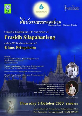 tui sakrapee September 20, 2023 สถาบันดนตรีกัลยาณิวัฒนา สำนักงานการวิจัยแห่งชาติ (วช.) และมูลนิธิดนตรีเพื่อชีวิต เชิญชมคอนเสิร์ต “ศิลปบรรเลงเพลงสยาม: Silapabanleng’s Siamese Music” tui sakrapee September 20, 2023 สถาบันดนตรีกัลยาณิวัฒนา สำนักงานการวิจัยแห่งชาติ (วช.) และมูลนิธิดนตรีเพื่อชีวิต ขอเชิญชมการแสดงคอนเสิร์ต “ศิลปบรรเลงเพลงสยาม: Silapabanleng’s Siamese Music” คอนเสิร์ตฉลอง 111 ปี อาจารย์ประสิทธิ์ ศิลปบรรเลง, 125 ปี หลวงวิจิตรวาทการ และ 50 ปีเสียชีวิตของ Klaus Pringsheim โดย ผศ.ดร.ชัญพงศ์ ทองสว่าง ร่วมด้วย วงอิมมานูเอลออร์เคสตรา นักดนตรีจากสถาบันดนตรีกัลยาณิวัฒนา ศิลปิน และนักแสดงรับเชิญ Concert to… Continue Reading