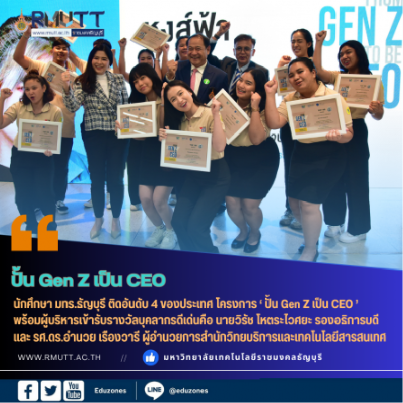 tui sakrapee September 19, 2023 มทร.ธัญบุรี คว้าอันดับ 4 ของประเทศ โครงการ ‘ปั้น Gen Z เป็น CEO’ tui sakrapee September 19, 2023 รศ.ดร.สมหมาย ผิวสอาด อธิการบดีมหาวิทยาลัยเทคโนโลยีราชมงคลธัญบุรี (มทร.ธัญบุรี) เผยว่า ตามที่กรมส่งเสริมการค้าระหว่างประเทศ กระทรวงพาณิชย์ โดยสถาบันพัฒนาผู้ประกอบการการค้ายุคใหม่ได้ดำเนินโครงการกระจายความรู้สู่ผู้ประกอบการยุคใหม่ ‘From Gen Z to be CEO’ ประจำปี 2566 ร่วมกับ มทร.ธัญบุรี ในการเพิ่มพูนองค์ความรู้ และพัฒนาศักยภาพด้านการค้าระหว่างประเทศให้กับผู้ประกอบการรุ่นใหม่ ซึ่งมีนักศึกษาจาก มทร.ธัญบุรี จำนวน 12 ราย สามารถทำแบบทดสอบของโครงการได้คะแนนสูงสุด 100 ลำดับแรกของประเทศ (TOP 100) จากจำนวนผู้เข้าร่วมโครงการทั่วประเทศกว่า 23,800… Continue Reading