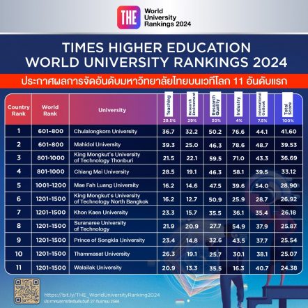 EZ Webmaster October 27, 2023 “คุณภาพงานวิจัย” ดัน มจธ. เป็นมหาวิทยาลัยไทยอันดับ 3 การจัดลำดับมหาวิทยาลัยชั้นนำของโลก Times Higher Education 2024 EZ Webmaster October 27, 2023 Times Higher Education (THE) องค์กรที่ให้บริการข้อมูลการศึกษาระดับอุดมศึกษาระดับโลก ได้ประกาศผลการจัดอันดับมหาวิทยาลัยชั้นนำของโลก Times Higher Education World University Rankings 2024 (THE 2024) ซึ่งจากการจัดอันดับ 2,673 มหาวิทยาลัย ปรากฏว่ามีสถาบันอุดมศึกษาของไทย ติด 1 ใน 1,000 ลำดับแรก รวม 4 สถาบัน คือ จุฬาลงกรณ์มหาวิทยาลัย และมหาวิทยาลัยมหิดล (อันดับที่ 601-800 ของโลก) อันดับที่ 3 ร่วม จำนวน 2 มหาวิทยาลัย ได้แก่ มหาวิทยาลัยเทคโนโลยีพระจอมเกล้าธนบุรี และ… Continue Reading