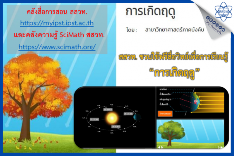 EZ Webmaster October 26, 2023 สสวท. ชวนใช้ฟรีสื่อวิทย์เพื่อการเรียนรู้ “การเกิดฤดู” EZ Webmaster October 26, 2023 ปลายฝนต้นหนาวปีนี้แว่วข่าวพยากรณ์อากาศว่าบ้านเราจะเข้าสู่ฤดูหนาวช้ากว่าปกติ และจะหนาวเย็นน้อยกว่าปีที่ผ่านมาด้วย สถาบันส่งเสริมการสอนวิทยาศาสตร์และเทคโนโลยี (สสวท.) ชวนคุณครูอธิบาย “การเกิดฤดู” สร้างความเข้าใจให้ชั้นเรียนแบบไม่ยุ่งยาก ด้วยสื่อ อินเตอร์แอ็กทีฟซิมูเลชัน ตอน การเกิดฤดู สื่อประกอบการจัดการเรียนการสอนวิชาวิทยาศาสตร์ มัธยมศึกษาตอนต้น ที่แสดงรังสีของแสงจากดวงอาทิตย์ที่ตกลงบนโลก ขณะโลกโคจรรอบดวงอาทิตย์ในลักษณะที่แกนโลกเอียงคงที่ ซึ่งส่งผลต่อการเปลี่ยนแปลงอุณหภูมิบนผิวโลกและส่งผลให้เกิดเป็น “ฤดู” ของโลกนั่นเอง ใช้ประกอบการสอนหรือเสริมความเข้าใจบทเรียนได้ คลิกเลยใช้ฟรีที่ คลังความรู้ SciMath สสวท. https://www.scimath.org/desktop-application/item/10591 หรือที่ คลังสื่อการสอน สสวท. https://myipst.ipst.ac.th/medias/การเกิดฤดู Continue Reading