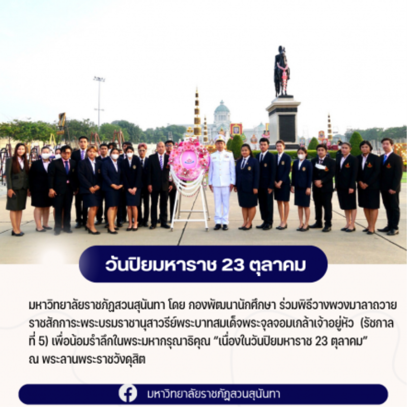 tui sakrapee October 24, 2023 สวนสุนันทา ร่วมพิธีวางพวงมาลาถวายราชสักการะเนื่องในวันปิยมหาราช tui sakrapee October 24, 2023 วันที่ 23 ตุลาคม 2566 เวลา 07.00 น. มหาวิทยาลัยราชภัฏสวนสุนันทา โดย กองพัฒนานักศึกษา ร่วมพิธีวางพวงมาลาถวายราชสักการะพระบรมราชานุสาวรีย์พระบาทสมเด็จพระจุลจอมเกล้าเจ้าอยู่หัว (รัชกาลที่ 5) เพื่อน้อมรำลึกในพระมหากรุณาธิคุณ “เนื่องในวันปิยมหาราช 23 ตุลาคม” ณ พระลานพระราชวังดุสิต โดยมี ผู้ช่วยศาสตราจารย์ ดร.เจตสฤษฎิ์ อังศุกาญจนกุล รองอธิการบดีฝ่ายกิจการนักศึกษา พร้อมด้วย นายนิพนธ์ ชัยพฤกษทล ผู้อำนวยการกองพัฒนานักศึกษา หัวหน้าฝ่าย บุคลากรและองค์กรนักศึกษาในสังกัดเข้าร่วมพิธีดังกล่าวอย่างพร้อมเพรียงกัน Continue Reading
