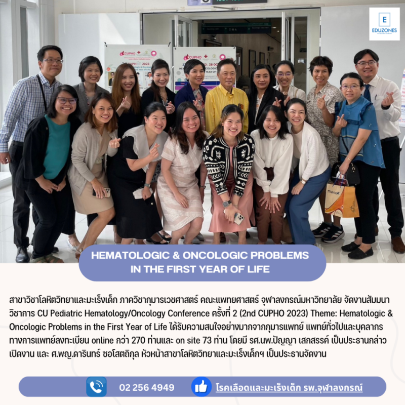 tui sakrapee November 1, 2023 tui sakrapee November 1, 2023 โลหิตวิทยาและมะเร็งเด็ก คณะแพทยศาสตร์ จุฬาฯ จัดงานสัมมนาวิชาการ CU Pediatric Hematology/Oncology Conference ครั้งที่ 2 สาขาวิชาโลหิตวิทยาและมะเร็งเด็ก ภาควิชากุมารเวชศาสตร์ คณะแพทยศาสตร์ จุฬาลงกรณ์มหาวิทยาลัย จัดงานสัมมนาวิชาการ CU Pediatric Hematology/Oncology Conference ครั้งที่ 2 (2nd CUPHO 2023) Theme: Hematologic & Oncologic Problems in the First Year of Life ได้รับความสนใจอย่างมากจากกุมารแพทย์ แพทย์ทั่วไปและบุคลากรทางการแพทย์ลงทะเบียน online กว่า 270 ท่านและ on site 73 ท่าน โดยมี รศ.นพ.ปัญญา เสกสรรค์ เป็นประธานกล่าวเปิดงาน และ ศ.พญ.ดารินทร์ ซอโสตถิกุล หัวหน้าสาขาโลหิตวิทยาและมะเร็งเด็กฯ เป็นประธานจัดงาน เมื่อวันที่ 28 ตุลาคม 2566 ณ โรงพยาบาลจุฬาลงกรณ์ สภากาชาดไทย “ถือเป็นความสำเร็จของการจัดอบรมครั้งนี้ ได้รับเกียรติจากวิทยากรผู้บรรยาย และแพทย์ผู้เชี่ยวชาญที่มีชื่อเสียง ทางโลหิตวิทยาและมะเร็ง เพื่อให้ผู้เข้าร่วมอบรมได้รับการถ่ายทอดความรู้และประสบการณ์การจากผู้เชี่ยวชาญที่มีประสบการณ์สูง และที่สำคัญที่สุดคือการได้มีโอกาสแลกเปลี่ยนเรียนรู้ซึ่งกันและกัน ในระหว่างบุคลากรทางการแพทย์ที่ปฏิบัติงานอยู่ในโรงพยาบาลต่าง ๆ ทั่วประเทศ” ศ.พญ.ดารินทร์ ซอโสตถิกุล หัวหน้าสาขาโลหิตวิทยาและมะเร็งเด็ก ภาควิชากุมารเวชศาสตร์คณะแพทยศาสตร์จุฬาลงกรณ์มหาวิทยาลัย ในฐานะประธานจัดงานฯ กล่าวเปิดเผย #สำนักข่าวการศึกษาไทย