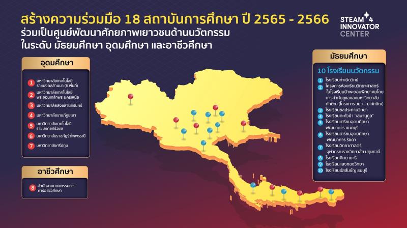 EZ Webmaster November 9, 2023 EZ Webmaster November 9, 2023 เอ็นไอเอชวนสถานศึกษาทั่วไทยเปิด “ห้องเรียนนวัตกรรม” พร้อมปลื้มความสำเร็จ 18 เครือข่ายสถานศึกษากับการสร้าง STEAM4INNOVATOR CENTER สร้างโค้ชใหม่ได้กว่า 500 ราย เด็กรุ่นใหม่รู้นวัตกรรมเพิ่มกว่า 10,000 คน สำนักงานนวัตกรรมแห่งชาติ (องค์การมหาชน) หรือ NIA กระทรวงการอุดมศึกษา วิทยาศาสตร์ วิจัย และนวัตกรรม (อว.) เผยความสำเร็จโครงการ “ศูนย์สร้างนวัตกรรุ่นใหม่-STEAM4INNOVATOR CENTER” พื้นที่สร้างเยาวชนในรั้วสถานศึกษาให้มีทักษะการสร้างนวัตกรรม โดยมีอาจารย์หรือครูทำหน้าที่เป็นโค้ชผู้สร้างนวัตกรนำองค์ความรู้และกระบวนการ STEAM4INNOVATOR ที่กระตุ้นการสร้างสรรค์นวัตกรรมบนฐาน STEAM อันได้แก่ วิทยาศาสตร์, เทคโนโลยี, วิศวกรรมศาสตร์, ศิลปะศาสตร์ และคณิตศาสตร์ พร้อมด้วยแนวคิดทางด้านธุรกิจที่เป็นระบบไปถ่ายทอดต่อให้เยาวชนได้พัฒนาฝึกฝนทักษะ ปัจจุบันได้มีการจัดตั้งศูนย์สร้างนวัตกรรุ่นใหม่ – STEAM4INNOVATOR CENTER รวม 18 ศูนย์ สร้างโค้ชผู้สร้างนวัตกรกว่า 500 คน และเข้าถึงนักเรียน/นักศึกษากว่า 10,000 คน ดร.กริชผกา บุญเฟื่อง ผู้อํานวยการสํานักงานนวัตกรรมแห่งชาติ (องค์การมหาชน) กล่าวว่า กลุ่มเยาวชนถือเป็นขุมกำลังสำคัญที่จะตอบโจทย์การสร้างประเทศนวัตกรรมในอนาคต ซึ่งแต่ละปี NIA ได้มีการร่วมกับเครือข่ายพันธมิตร ทั้งมหาวิทยาลัยและโรงเรียนนำเครื่องมือช่วยสร้างนวัตกร ด้วยหลักสูตร STEAM4INNOVATOR เข้าไปถ่ายทอดให้เยาวชนและคนรุ่นใหม่กว่า 10,000 ราย ในหลากหลายรูปแบบ เพื่อกระตุ้นการสร้างสรรค์นวัตกรรมบนฐาน สะตีม: STEAM โครงการ “ศูนย์สร้างนวัตกรรุ่นใหม่ – STEAM4INNOVATOR CENTER” ซึ่งเป็นอีกหนึ่งรูปแบบการเข้าถึงเยาวชนที่มีประสิทธิภาพ เนื่องจากสามารถกระจายการดำเนินงานได้อย่างกว้างขวางทั้งในระบบมหาวิทยาลัยและโรงเรียน ซึ่งนอกจากการพัฒนาการเรียนรู้ของนักเรียน/นักศึกษาแล้ว ยังให้ความสำคัญกับการฝึกสอนครู/อาจารย์ให้เป็น “ผู้สร้างนวัตกร” ที่สามารถสร้างนวัตกรรุ่นเยาว์ได้อย่างต่อเนื่องและยั่งยืนจากรุ่นสู่รุ่น ทั้งนี้ โครงการศูนย์สร้างนวัตกรรุ่นใหม่-STEAM4INNOVATOR CENTER เริ่มก่อตั้งมาตั้งแต่ปี 2565 ด้วยความร่วมมือจาก 5 สถาบันการศึกษา ได้แก่ มหาวิทยาลัยเทคโนโลยีราชมงคลล้านนา มหาวิทยาลัยเทคโนโลยีพระจอมเกล้าพระนครเหนือ มหาวิทยาลัยสงขลานครินทร์ มหาวิทยาลัยราชภัฏยะลา และสำนักงานคณะกรรมการการอาชีวศึกษา และในปี 2566 นี้ มีเพิ่มเติมอีก 3 มหาวิทยาลัย ได้แก่ มหาวิทยาลัยศรีปทุม มหาวิทยาลัยเทคโนโลยีราชมงคลศรีวิชัย มหาวิทยาลัยราชภัฏรำไพพรรณี และขยายผลสู่ระดับมัธยมศึกษา 10 โรงเรียน ได้แก่ โรงเรียนกำเนิดวิทย์ โครงการห้อ