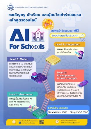 EZ Webmaster November 23, 2023 สสวท. อบรมครูออนไลน์ “ปัญญาประดิษฐ์ สำหรับโรงเรียน” ฟรี เรียนรู้เท่าทัน AI ใช้งานสร้างสรรค์ ชั้นเรียนทันยุค EZ Webmaster November 23, 2023 สถาบันส่งเสริมการสอนวิทยาศาสตร์และเทคโนโลยี (สสวท.) ขอเชิญครู นักเรียนและผู้สนใจอบรมฟรีด้วยระบบออนไลน์ “ปัญญาประดิษฐ์ สำหรับโรงเรียน (AI for Schools)” รุ่นที่ 5 ผ่านเว็บไซต์ https://teacherpd.ipst.ac.th จำนวน 4 หลักสูตรคือ Level 1 : Awareness ความรู้เบื้องต้นเกี่ยวกับ AI รู้จัก AI ในชีวิตประจำวันและรู้เท่าทัน AI Level 2 : AI components & basic concepts แนวคิดในการพัฒนา AI องค์ประกอบและรูปแบบการตัดสินใจของ AI Agent หลักการของ AI ในชีวิตประจำวันและผลกระทบจากเทคโนโลยี AI Level 3 : Model รู้จักวิธีการใช้ AI เพื่อสอนให้คอมพิวเตอร์สามารถจำแนกประเภทข้อมูล และทำนายค่าเชิงปริมาณโดยอัตโนมัติได้อย่างแม่นยำ Level 4 : Integration พัฒนา AI application สู่การใช้งานจริง สมัครและอบรมได้ตั้งแต่วันที่ 20 พฤศจิกายน 2566 ถึง 20 กุมภาพันธ์ 2567 ผ่านเว็บไซต์ https://teacherpd.ipst.ac.th เมื่ออบรมผ่านแต่ละระดับแล้วจะได้รับวุฒิบัตรด้วย สอบถามได้ที่เพจสาขาคอมพิวเตอร์ สสวท. https://www.facebook.com/oho.ipst Continue Reading