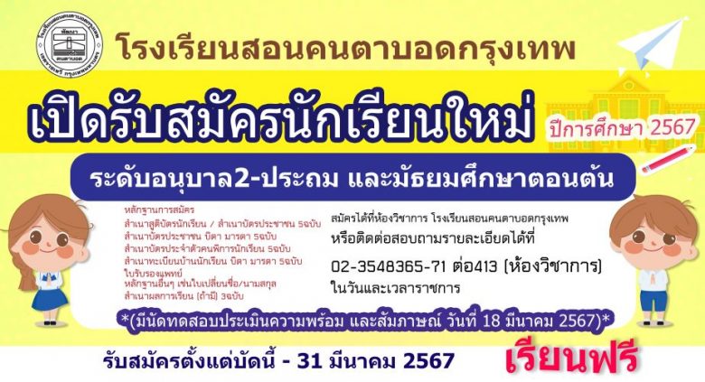 EZ Webmaster November 24, 2023 “โรงเรียนสอนคนตาบอดกรุงเทพ” เปิดรับสมัคร นร. ใหม่ ประจำปีการศึกษา 2567 EZ Webmaster November 24, 2023 “โรงเรียนสอนคนตาบอดกรุงเทพ” เปิดรับสมัครนักเรียนใหม่ ประจำปีการศึกษา 2567 ระดับชั้นอนุบาล 2 ประถมศึกษาและมัธยมศึกษาตอนต้น หลักฐานประกอบการสมัคร: – สําเนาสูติบัตร/สำเนาบัตรประชาชนของนักเรียน จำนวน 5 ฉบับ – สําเนาบัตรประชาชน (บิดา-มารดา) จำนวน 5 ฉบับ – สําเนาบัตรประจําตัวคนพิการของนักเรียน จำนวน 5 ฉบับ – สําเนาทะเบียนบ้านของ นักเรียน-บิดา-มารดา จำนวน 5 ฉบับ – ใบรับรองแพทย์… Continue Reading