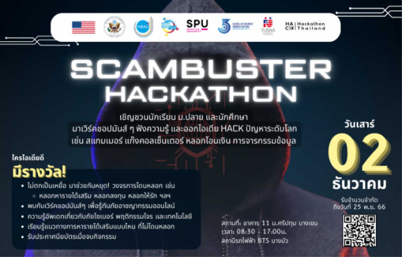 EZ Webmaster November 14, 2023 SPU ชวนน้อง ม.ปลาย มา Workshop “ScamBuster Hackathon #1” ScamBuster Hackathon ครั้งที่ 1 EZ Webmaster November 14, 2023 เครือข่ายศิษย์เก่าโครงการแลกเปลี่ยนไทย-สหรัฐอเมริกา ด้วยการสนับสนุนจากทุน YSEALI YOUnified โดย U.S. Embassy in Bangkok และคณะบริหารธุรกิจ มหาวิทยาลัยศรีปทุม ขอเชิญน้องๆ ม.ปลาย ที่สนใจมาเช้าร่วมค่ายเวิร์คชอปหนึ่งวัน สไตล์ Hackathon เพื่อเรียนรู้ ป้องกันการโกง และหยุดยั้งมิจฉาชีพออนไลน์ (Scammer) โดยค่ายนี้จะเปิดโอกาสให้ทุกคนได้เข้ามาทำความเข้าใจกลโกงมิจฉาชีพออนไลน์ในรูปแบบต่างๆ อย่างครบวงจรเป็นครั้งแรกของประเทศไทย! ทำกิจกรรมร่วมกับผู้เชี่ยวชาญ เช่น ตำรวจ อัยการ software engineer นักธุรกิจ และทนายความ ลงมือทำเวิร์คชอป ระดมไอเดีย เพื่อช่วยให้สังคม รู้จักป้องกัน และเอาตัวรอดจากพวก Scammer แสดงไอเดีย และฝีมือ ทำสื่อ (Media) เพื่อให้ความรู้ หรือ ป้องกันมิจฉาชีพออนไลน์ พิเศษสุดๆ !!… Continue Reading