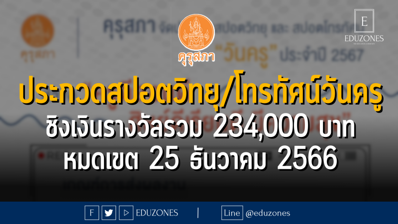 EZ Webmaster December 23, 2023 EZ Webmaster December 23, 2023 คุรุสภา จัดประกวดสปอตวิทยุและสปอตโทรทัศน์วันครู ประจำปี 2567 หัวข้อ “ครูดีสอนดี ศิษย์ดีเรียนดี มีความสุข” ชิงเงินรางวัลรวม 234,000 บาท : หมดเขต 25 ธันวาคม 2566 คุรุสภา จัดประกวดสปอตวิทยุและสปอตโทรทัศน์วันครู ประจำปี 2567 หัวข้อ “ครูดีสอนดี ศิษย์ดีเรียนดี มีความสุข” ชิงเงินรางวัลรวม 234,000 บาท : หมดเขต 25 ธันวาคม 2566 คุรุสภา จัดประกวดสปอตวิทยุและสปอตโทรทัศน์วันครู ประจำปี 2567 หัวข้อ “ครูดีสอนดี ศิษย์ดีเรียนดี มีความสุข” ชิงเงินรางวัลรวม 234,000 บาท : หมดเขต 25 ธันวาคม 2566 . รายละเอียด หัวข้อ : “ครูดีสอนดี ศิษย์ดีเรียนดี มีความสุข” ส่งเข้าประกวดเป็นทีม ๆ ละ 2 – 5 คน หรือส่งผลงานดี่ยว ไม่จำกัดรูปแบบและเทคนิคในการนำเสนอ ความยาว 0.30 – 1 นาที สามารถส่งผลงานเข้าประกวดได้ประเภทละ 1 ผลงานเท่านั้น (สปอตวิทยุ 1 ผลงาน และสปอตโทรทัศน์ 1 ผลงาน) . รางวัล สปอตวิทยุวันครู 5 รางวัล รางวัลชนะเลิศ : รับเงินรางวัล จำนวน 30,000 บาท รางวัลรองชนะเลิศ อันดับ 1 รับเงินรางวัล จำนวน 20,000 บาท รางวัลรองชนะเลิศ อันดับ 2 รับเงินรางวัล จำนวน 10,000 บาท รางวัลชมเชย จำนวน 2 รางวัล ๆ ละ 7,000 บาท สปอตโทรทัศน์วันครู มี 5 รางวัล รางวัลชนะเลิศ รับเงินรางวัล จำนวน 50,000 บาท รางวัลรองชนะเลิศ อันดับ 1 รับเงินรางวัล จำนวน 40,000 บาท รางวัลรองชนะเลิศ อันดับ 2 รับเงินรางวัล จำนวน 30,000 บาท รางวัลชมเชย จำนวน 2 รางวัล ๆ ละ 20,000 บาท . สมัครการประกวด “สปอตวิทยุ” วันครู ประจำปี 2567 : คลิก สมัครการประกวด “สปอตโทรทัศน์” วันครู ประจำปี 2567 : คลิก แหล่งที่มา : คลิก