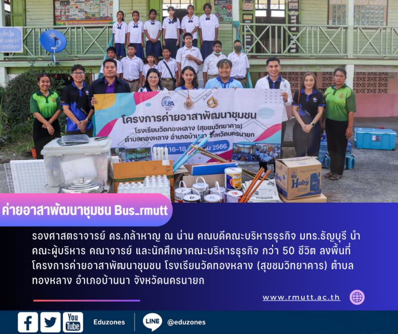 tui sakrapee December 27, 2023 tui sakrapee December 27, 2023 น.ศ.บริหารธุรกิจ มทร.ธัญบุรี ออกค่ายอาสาพัฒนาชุมชน ช่วยน้องโรงเรียนวัดทองหลาง นครนายก ผู้บริหาร คณาจารย์ และนักศึกษาคณะบริหารธุรกิจ กว่า 50 ชีวิต ลงพื้นที่โครงการค่ายอาสาพัฒนาชุมชน โรงเรียนวัดทองหลาง (สุขชมวิทยาคาร) ตำบลทองหลาง อำเภอบ้านนา จังหวัดนครนายก โครงการฝ่ายพัฒนาสังคมและบำเพ็ญประโยชน์ สโมสรนักศึกษาคณะบริหารธุรกิจ มหาวิทยาลัยเทคโนโลยีราชมงคลธัญบุรี (มทร.ธัญบุรี) รองศาสตราจารย์ ดร.กล้าหาญ ณ น่าน คณบดีคณะบริหารธุรกิจ เผยว่า ค่ายอาสาในครั้งนี้เกิดจากความมุ่งมั่นของนักศึกษาเพื่อจะพัฒนาสถานที่ให้เป็นประโยชน์ต่อส่วนรวม ซึ่งโรงเรียนวัดทองหลาง (สุขชมวิทยาคาร) เป็นการทำค่ายอาสาให้เหมาะสมกับนักเรียนประถมศึกษา ทางโรงเรียนมีความประสงค์อยากให้ทาสีถนนเพื่อให้เด็กประถมศึกษาได้วิ่งเล่น ใช้งานและเพื่อความสวยงาม จึงขอความอนุเคราะห์จากผู้ดำเนินโครงงานการ จึงเห็นว่าจำเป็นต้องมีการปรับปรุงและซ่อมแซมถนนและทาสี นอกจากนี้ผู้ดำเนินโครงการยังเสริมความรู้เรื่องการบริหารเพิ่มเติมได้ให้กับนักเรียนในโรงเรียน จัดทำสื่อการเรียนการสอนหลักบริหารธุรกิจขั้นพื้นฐานเผยแพร่ให้กับนักเรียน ซึ่งโครงการได้รับความสนใจจากนักศึกษาจิตอาสาคณะบริหารธุรกิจ เป็นโครงการที่สร้างจิตสำนึกรับผิดชอบสังคมให้กับนักศึกษาอีกหนึ่งโครงการ ทางด้าน นายเกรียงไกร บำรุงวงศ์ ผู้อำนวยการโรงเรียนวัดทองหลาง(สุขชมวิทยาการ) เผยว่า เป็นโรงเรียนขนาดเล็ก มีนักเรียนจำนวน 70 คน ครูประจำ 5 คน ครูอัตราจ้าง 2 คน ทางโรงเรียนต้องการบูรณะถนนหน้าอาคารเรียน ต้องการอุปกรณ์ทางการเรียน ได้มีโอกาสคุยกับศิษย์เก่าที่ไปศึกษาใน มทร.ธัญบุรี ศิษย์เก่าเป็นผู้ประสานงาน โครงการนี้ได้ผลเกิดคาด จากที่คาดหวังไว้ 80 % ทางมหาวิทยาลัยทำได้ 100 % จากการสำรวจความเห็นของคุณครูและนักเรียน ทุกคนชอบ สื่อการเรียนรู้บนถนนหน้าอาคารเรียน สื่อการเรียนรู้ บอร์ดความรู้ต่าง ๆ ตลอดจนการสอนความรู้ในเรื่องของการบริหารพื้นฐานและภาษาอังกฤษ ตลอดระยะเวลา 3 วัน นักศึกษามีความตั้งใจในการทำจิตอาสา “ธันวา” นายธันวา คงเพชร นักศึกษาชั้นปีที่ 4 สาขาวิชาหลักสูตรนานาชาติ ประธานฝ่ายพัฒนาสังคมและบำเพ็ญประโยชน์ เล่าว่า กว่า 3 ปี ที่เกิดโควิค-19 เป็นการออกค่ายอาสาของฝ่ายพัฒนาสังคมและบำเพ็ญประโยชน์ครั้งแรก จากการลงพื้นที่สำรวจความต้องการของทางโรงเรียนได้นำข้อมูลมาปรึกษากับเพื่อนในค่ายอาสา โดยได้วางแผนและแบ่งงานรับผิดชอบ ซึ่งใช้เวลาในการดำเนินงาน 3 วัน วันที่ 1 ลง