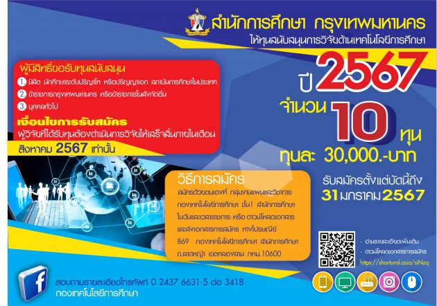 EZ Webmaster December 7, 2023 สำนักการศึกษา กรุงเทพมหานคร ให้ทุนสนับสนุนการวิจัยด้านเทคโนโลยีการศึกษา ประจำปีงบประมาณ พ.ศ. 2567 EZ Webmaster December 7, 2023 ประกาศสำนักการศึกษา เรื่อง การให้ทุนสนับสนุนการวิจัยด้านเทคโนโลยีเพื่อการศึกษา ประจำปีงบประมาณ พ.ศ. 2567 สำนักการศึกษา กรุงเทพมหานคร จะดำเนินการจัดสรรทุนสนับสนุนการวิจัยด้านเทคโนโลยีเพื่อการศึกษา ประจำปีงบประมาณ พ.ศ. 2567 จำนวน 10 ทุน ทุนละ 30,000 บาท โดยผู้สนใจสามารถดาวน์โหลด ประกาศพร้อมใบสมัครและหนังสือรับรอง ได้ตามลิงค์นี้ https://www.shorturl.asia/d8rOn ประกาศทุนวิจัยปีงบประมาณ 2567 Continue Reading