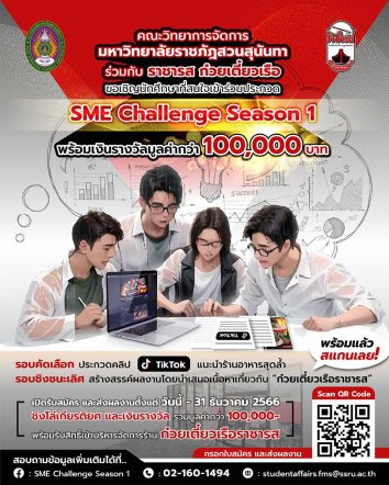 tui sakrapee December 7, 2023 สวนสุนันทาชวนนักศึกษาชั้นปี 1-4 ร่วมประกวดคลิปสั้น ผ่าน TikTok รีวิวร้านอาหารสุดล้ำ ชิงทุนมูลค่ากว่า 1 แสนบาท tui sakrapee December 7, 2023 คณะวิทยาการจัดการ มหาวิทยาลัยราชภัฏสวนสุนันทา ร่วมกับ ราชารส ก๋วยเตี๋ยวเรือ ขอเชิญนักศึกษาชั้นปี 1-4 ส่งผลงานเข้าร่วมการประกวดคลิป VDO สั้น ผ่านแอปพลิเคชัน TikTok นำเสนอ การรีวิวร้านอาหารสุดล้ำ (โดยเป็นร้านอาหาร ไหนก็ได้) (พร้อมติด hashtag #มหาวิทยาลัยราชภัฏสวนสุนันทาร่วมกับก๋วยเตี๋ยวเรือราชารส #SSRU #ก๋วยเตี๋ยวเรืออร่อยก๋วยเตี๋ยวเรือราชารส #SMEChallengeSeason1) เกณฑ์การประกวด 1. ผู้เข้าร่วมประกวดต้องศึกษาอยู่ในระดับอุดมศึกษาหรือเทียบเท่าปริญญาตรี จากสถาบันการศึกษาที่ กระทรวงอุดมศึกษา วิทยาศาสตร์ วิจัยและนวัตกรรม รับรอง 2. จำกัดสมาชิกทีมละไม่เกิน 3… Continue Reading