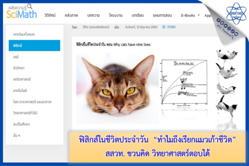 EZ Webmaster December 22, 2023 ฟิสิกส์ในชีวิตประจำวัน “ทำไมถึงเรียกแมวเก้าชีวิต” สสวท. ชวนคิด วิทยาศาสตร์ตอบได้ EZ Webmaster December 22, 2023 สถาบันส่งเสริมการสอนวิทยาศาสตร์และเทคโนโลยี (สสวท.) ชวนไขข้อข้องใจทำไมถึงมีคำกล่าวว่า แมวมีเก้าชีวิตกับ ฟิสิกส์ในชีวิตประจำวัน ตอน Why cats have nine lives บทเรียนเสริมความรู้ฟิสิกส์ระดับมัธยมศึกษาตอนปลาย พบกับเหตุผลทางวิทยาศาสตร์ที่เฉลยข้อกังขาและช่วยให้เราเข้าใจสถานการณ์หวาดเสียวเมื่อแมวตกจากที่สูงและรอดชีวิต โดยทำการศึกษาข้อมูลทางสถิติและปัจจัยที่เกี่ยวข้อง ข้อสำคัญเรื่องนี้ฟิสิกส์เปิดประตูสู่ความกระจ่างให้ได้ บรรดาทาสแมว ใจดีหรือแม้แต่คนที่ไม่ได้เลี้ยงแมวก็ไม่ควรพลาด เสริมสร้างความรู้ได้กับ “ฟิสิกส์ในชีวิตประจำวัน ตอน Why cats have nine lives” ที่ คลังความรู้ SciMath สสวท. https://www.scimath.org/lesson?filter=ฟิสิกส์ Continue Reading