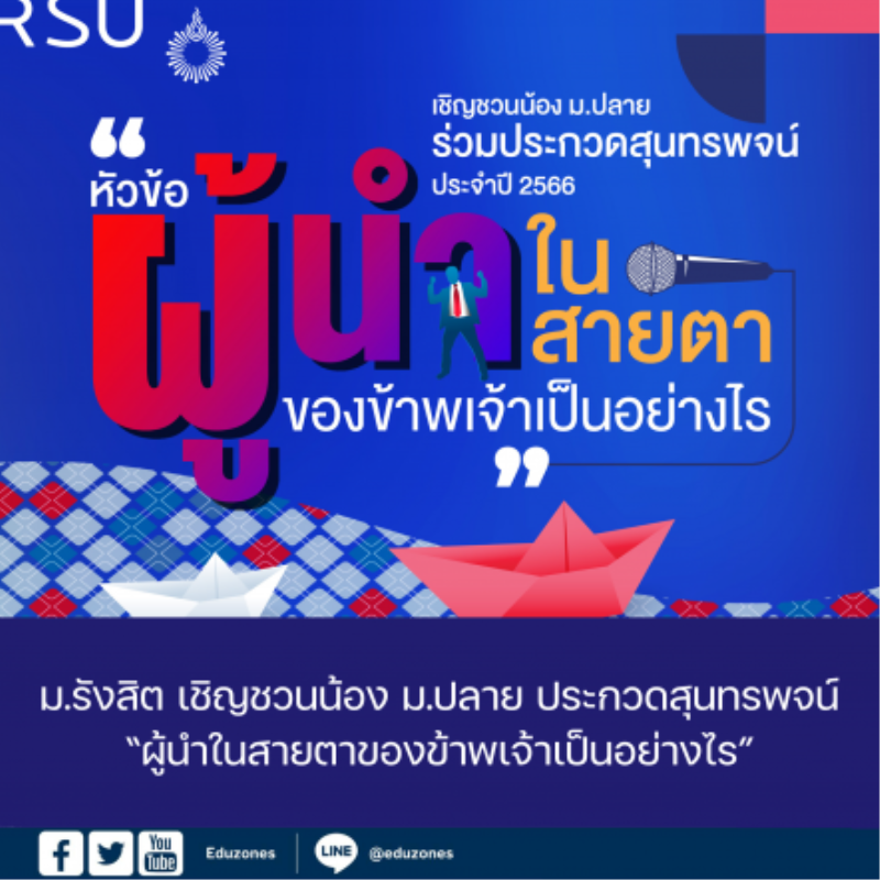 EZ Webmaster December 21, 2023 ม.รังสิต เชิญชวนน้อง ม.ปลาย ประกวดสุนทรพจน์ ประจำปี 2566 หัวข้อ “ผู้นำในสายตาของข้าพเจ้าเป็นอย่างไร” EZ Webmaster December 21, 2023 คณะรัฐศาสตร์ มหาวิทยาลัยรังสิต เปิดรับสมัครนักเรียนที่มีอายุระหว่าง 15-18 ปี ร่วมโครงการประกวดสุนทรพจน์ ประเภทเยาวชน ปีการศึกษา 2566 ภายใต้หัวข้อ “ผู้นำในสายตาของข้าพเจ้าเป็นอย่างไร” ในวันศุกร์ที่ 23 กุมภาพันธ์ 2567 ณ ห้อง 6-200 อาคาร Student Center (อาคาร 6) มหาวิทยาลัยรังสิต สำหรับผู้ที่สนใจสามารถอัดคลิปความยาวมาต่ำกว่า 5 นาที แต่ไม่เกิน 7 นาที โดยส่งก่อน 16.00… Continue Reading