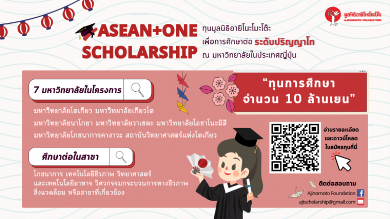 EZ Webmaster December 20, 2023 มูลนิธิอายิโนะโมะโต๊ะ เปิดรับสมัครทุนศึกษาวิจัย และปริญญาโท โครงการ “ASEAN+ONE SCHOLARSHIP” ประจำปี พ.ศ. 2568 EZ Webmaster December 20, 2023 มูลนิธิอายิโนะโมะโต๊ะ เปิดรับสมัครทุนศึกษาวิจัย และปริญญาโท โครงการ “ASEAN+ONE SCHOLARSHIP” ประจำปีการศึกษา 2568 ในสาขา โภชนาการ วิทยาศาสตร์และเทคโนโลยีทางอาหาร เทคโนโลยีชีวภาพ วิศวกรรมกระบวนการทางชีวภาพ และสิ่งแวดล้อมหรือสาขาที่เกี่ยวข้อง ณ มหาวิทยาลัยชั้นนำ 7 แห่ง ของประเทศญี่ปุ่น มูลค่ากว่า 10 ล้านเยน โดยเป็นทุนให้เปล่า ไม่ต้องสอบข้อเขียน และไม่ต้องใช้เงินทุนคืน เปิดรับสมัครแล้วตั้งแต่วันนี้ ถึงวันที่ 8 มีนาคม 2567 สามารถดูไฟล์ภาพและรายละเอียดเนื้อหาข่าวได้จากไฟล์แนบ ติดตามข่าวสาร… Continue Reading