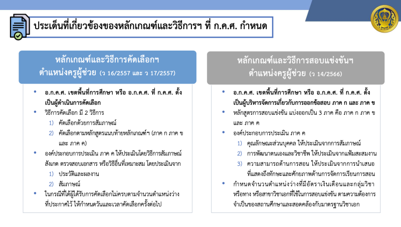 EZ Webmaster January 14, 2024 EZ Webmaster January 14, 2024 อนาคตภาพ พลิกโฉมการบริหารงานบุคคล ข้าราชการครู และ บุคลากรทางการศึกษา การสัมมนา อ.ก.ค.ศ. เขตพื้นที่การศึกษา วันพุธ 10 มกราคม พ.ศ.2567 โดย ท่านรองศาสตราจารย์ ดร.ประวิต เอราวรรณ์ (เลขาธิการ ก.ค.ศ.) ตระหนักถึงการพลิกโฉมการงานบุคคลของข้าราชการครู และ บุคลากรทางการศึกษา สู่ความเชื่อมั่น ทันสมัย และ มีประสิทธิภาพ ซึ่งประกอบด้วยดังต่อไปนี้ กรอบแนวคิดในการกำหนดแผนการทำงานของสำนักงาน ก.ค.ศ. คุณภาพของนักเรียนแต่ละประเทศ ขึ้นอยู่กับคุณภาพของ “ครู” ปัญหาด้านการศึกษาของประเทศไทย แนวคิดระบบพัฒนาวิชาชีพครู 5 คานงัด การบริหารงานบุคคลข้าราชการครู และ บุคลากรทางการศึกษา กำหนดมาตรฐานตำแหน่ง และ มาตรฐานวิทยฐานะใหม่ (ว3/2564 ว4/2564) ปรับระบบการประเมินวิทยฐานะ ควบคู่กับการประเมินเงินเดือน (ว9 – ว12/2564) ปรับระบบการพัฒนาผู้บริหารก่อนเข้าสู่ตำแหน่ง (มติ ก.ค.ศ. ครั้งที่ 9/2564) กำหนดเกณฑ์อัตรากำลังของสถานศึกษาให้สอดคล้องกับการเปลี่ยนแปลง (ว23/2536 กำหนดอัตรากำลังของ รร. ว24/2564 กำหนดการวิธีการบริหารอัตรากำลัง ว10/2565 วิธีการบริหารจัดการ รร. ขนาดเล็ก) วางแผนการผลิตและระบบคัดกรองครูที่มีคุณภาพระบบการศึกษา (MOU กับ สภาคณบดีครุศาสตร์/ศึกษาศาสตร์) 3 หลุมดำ แห่งมายาคติ หลุมที่ 1 มโนทัศน์เกี่ยวกับวิทยฐานะที่คลาดเคลื่อน ระดับความเชี่ยวชาญในวิชาชีพ พัฒนาฝีมือสอนจากการลงมือปฏิบัติจริงในหน้างาน และ พิสูจน์ผลลัพธ์ วิทยฐานะ ไม่ใช่รางวัล หรือ สวัสดิการ หลุมที่ 2 ประเมินสิ่งที่ไม่ใช่หน้างานของครู ผลการปฏิบัติงานเชิงวิชาชีพ (Professional Performance) ไม่ใช่การผลิตผลงานเชิงวิชาการ (Academic Works) หลุมที่ 3 ไปไม่ถึงผลลัพธ์ที่เกิดกับผู้เรียนอย่างแท้จริง ตัดสินที่รางวัล รายงานทางวิชาการ หรือ วัดผลสัมฤทธิ์จากคะแนนสอบ แต่ผลลัพธ์การเรียนรู้แท้จริงนั้นอยู่ที่ตัวผู้เรียนวัย และ สภาพของผู้เรียน แนวคิดจำเป็น สำหรับนักบริหารการเปลี่ยนแปลงทางการศึกษา ในศตวรรษ 21 Student Oriented / Student Solution Quality of Curriculum & Students Core Competency Development Mentor Coaching Process Oriented / QA QI Creative Research and Innovation Pool : Alliance : Linkage Collective Leadership การประชุมสัมมนาคณะกรรมการ อ.ก.ค.ศ เขตพื้นที่การศึกษา วันพุธที่ 10 มกราคม 2567 (ที่ผ่านมา) กำหนดการ การบรรยายพิเศษ “อนาคตภาพการพลิกโฉมการบริหารงานบุคคลข้าราชการครู และบุคลากรทางการศึกษา” โดย รองศาสตราจารย์ ประวิต เอราวรรณ์ เลขาธิการ ก.ค.ศ. การบรรยายหัวข้อ การดำเนินการบริหารงานบุคคลของสำนักงาน ก.ค.ศ.โดย คณะผู้บริหารสำนักงาน ก.ค.ศ. ปฏิทินการบริหารงานบุคคลของข้าราชการครู และ บุคลากรทางการศึกษา การย้ายครู การสรรหา ตำแหน่งครูผู้ช่วย ระบบการบริหารอัตรากำลังขอ