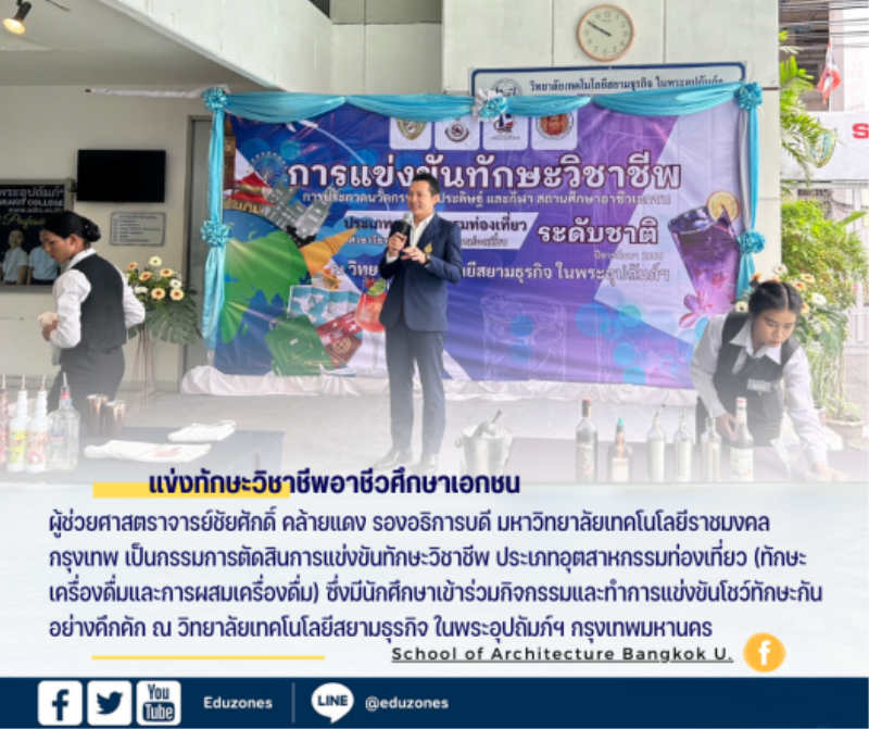 tui sakrapee January 25, 2024 รองอธิการบดี มทร.กรุงเทพร่วมตัดสินการแข่งขันทักษะวิชาชีพ อุตสาหกรรมท่องเที่ยว สถานศึกษาอาชีวศึกษาเอกชน tui sakrapee January 25, 2024 วิทยาลัยเทคโนโลยีสยามธุรกิจ ในพระอุปถัมภ์ฯ จัดการเรียนการสอน หลักสูตรอาชีวศึกษา ระดับประกาศนียบัตรวิชาชีพ (ปวช.) และประกาศนียบัตรวิชาชีพชั้นสูง (ปวส.) สาขาการโรงแรมและการท่องเที่ยว โดยมีวัตถุประสงค์เพื่อให้ผู้เรียนได้พัฒนาทางด้านการจัดการอุตสาหกรรมบริการ ให้มีความรู้ ความสามารถในการปฏิบัติงานได้อย่างมืออาชีพและมีประสิทธิภาพ เกี่ยวกับทักษะวิชาชีพการโรงแรม จึงได้เป็นเจ้าภาพจัดการแข่งขันทักษะวิชาชีพประเภทอุตสาหกรรมท่องเที่ยว สถานศึกษาอาชีวศึกษาเอกชน ระดับชาติ ปีการศึกษา 2566 โดยสมาคมวิทยาลัยเทคโนโลยีและอาชีวศึกษาเอกชนแห่งประเทศไทยในพระราชูปถัมภ์สมเด็จพระเทพรัตนราชสุดาฯ สยามบรมราชกุมารี ในวันพฤหัสบดี ที่ 25 เดือน มกราคมพ.ศ. 2567 ณ วิทยาลัยเทคโนโลยีสยามธุรกิจ ในพระอุปถัมภ์ฯ กรุงเทพมหานคร ทั้งนี้คณะกรรมการจัดการแข่งขันได้รับเกียรติจาก ผู้ช่วยศาสตราจารย์ชัยศักดิ์… Continue Reading