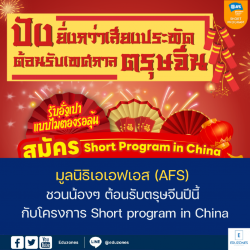 EZ Webmaster January 26, 2024 มูลนิธิเอเอฟเอส (AFS) ชวนน้องๆ ต้อนรับตรุษจีนปีนี้ กับโครงการ Short program in China EZ Webmaster January 26, 2024 📢 ต้อนรับตรุษจีนปีนี้ กับ โครงการรับสมัคร 𝙎𝙝𝙤𝙧𝙩 𝙥𝙧𝙤𝙜𝙧𝙖𝙢 𝙞𝙣 𝘾𝙝𝙞𝙣𝙖 ✏️ สมัครด่วน วันนี้ – 15 ก.พ.2567 เท่านั้น‼ ⚠ 🌟รับอั่งเปาสุดปังแบบไม่ต้องรอลุ้น..🌟 “สิทธิเข้าค่ายภาษาเเละวัฒนธรรมจีนจอหงวน” (ค่ายพัฒนาทักษะภาษาจีนและเรียนรู้วัฒนธรรมก่อนเดินทาง✈️ ) – ผู้เข้าร่วมโครงการ อายุ 15 – 18 ปี – ระยะเวลา 4 สัปดาห์ (1… Continue Reading