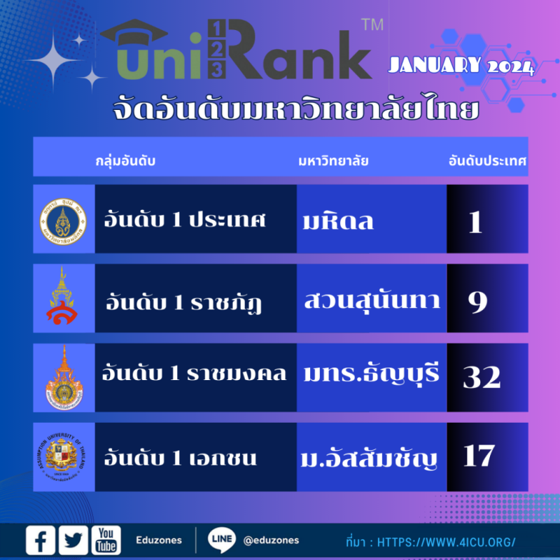 tui sakrapee February 8, 2024 tui sakrapee February 8, 2024 มหา’ลัยยอดนิยม Unirank January 2024 จัดอันดับ “สวนสุนันทา-มทร.ธัญบุรี” ยืนที่ 1 แน่น ”เอแบค” กลับที่ 1 กลุ่มเอกชน ที่ 1 ประเทศ “มหิดล” ครองอีกสมัย เว็บไซต์จัดอันดับสถาบันการศึกษา 4Icu หรือ “Unirank” ซึ่งได้รับการยอมรับจากประเทศต่าง ๆ ถึง 200 ประเทศ และสถาบันการศึกษาอีกกว่า 14,000 แห่ง ประกาศการจัดอันดับมหาวิทยาลัยยอดนิยมในประเทศไทย “Unirank” Top Universities in Thailand 2024 Thai University Ranking ประจำเดือนมกราคม 2024 โดยในปี 2024 เดือนมกราคมนี้มี 123 สถาบันอุดมศึกษาของไทยที่เข้าเกณฑ์การคัดเลือก uniRank ผลการจัดอันดับปรากฏว่า อันดับครึ่งปีแรก มหาวิทยาลัยมหิดล ยังครองที่ 1 ของประเทศไทย โดยมีอันดับ 2 คือจุฬาฯ และ ม.เชียงใหม่ ตามมาเป็นอันดับ 3 ส่วนมหาวิทยาลัยราชภัฏสวนสุนันทา ยังครองแชมป์ม.ราชภัฏ ยืนอันดับ 9 ของประเทศ สำหรับกลุ่มมหาวิทยาลัยเทคโนโลยีราชมงคล ปีนี้ มหาวิทยาลัยเทคโนโลยีราชมงคลธัญบุรี ยังครองอันดับ 1 โดยอยู่อันดับที่ 32 ของประเทศ ด้านม.เอกชน มหาวิทยาลัยอัสสัมชัญ กลับขึ้นมายืนที่ 1 เอาไว้ได้อีกครั้ง 50 อันดับแรกของประเทศไทย อันดับ มหาวิทยาลัย Unirank 2024 จัดมหา’ลัยยอดนิยม ของครึ่งปีแรก “สวนสุนันทา-มทร.ธัญบุรี” รั้งที่ 1 เหนียวแน่น ”เอแบค” กลับที่ 1 กลุ่มเอกชน ส่วนที่ 1 ประเทศ “มหิดล” ครองอีกสมัย อันดับ มหาวิทยาลัย เมือง 1 มหาวิทยาลัยมหิดล นครปฐม 2 จุฬาลงกรณ์มหาวิทยาลัย กรุงเทพฯ 3 มหาวิทยาลัยเชียงใหม่ เชียงใหม่ 4 มหาวิทยาลัยเกษตรศาสตร์ กรุงเทพฯ 5 มหาวิทยาลัยสงขลานครินทร์ หาดใหญ่ … 6 มหาวิทยาลัยขอนแก่น ขอนแก่น … 7 มหาวิทยาลัยธรรมศาสตร์ กรุงเทพฯ 8 สถาบันเทคโนโลยีแห่งเอเชีย คลองหลวง 9 มหาวิทยาลัยราชภัฏสวนสุนันทา กรุงเทพฯ 10 มหาวิทยาลัยเทคโนโลยีพระจอมเกล้าธนบุรี กรุงเทพฯ … 11 มหาวิทยาลัยรามคำแหง กรุงเทพฯ … 12 สถาบันเทคโนโลยีพระจอมเกล้าเจ้าคุณทหารลาดกระบัง กรุงเทพฯ … 13 มหาวิทยาลัยศรีนครินทรวิโรฒ กรุงเทพฯ 14 มหาวิทยาลัยบูรพา ชลบุรี 15 มหาวิทยาลัยนเรศวร พิษณุโลก 16 มหาวิทยาลัยศิลปากร กรุงเทพฯ 17 มหาวิทยาลัยอัสสัมชัญ กรุงเทพฯ … 18 มหาวิทยาลัยเทคโนโลยีสุรนารี นครราชสีมา 19 มหาวิทยาลัยศรีปทุม กรุงเทพฯ 20 มหาวิทยาลัยเทคโนโลยีพระจอมเกล้าพระนครเหนือ กรุงเทพฯ … 21 มหาวิทยาลัยรังสิต ปทุมธานี 22 มหาวิทยาลัยกรุงเทพ กรุงเทพฯ 23 มหาวิทยาลัยวลัยลักษณ์ นครศรีธรรมราช 24 มหาวิทยาลัยอุบลราชธานี อุบลราชธานี 25 มหาวิทยาลัยสวนดุสิต กรุงเทพฯ … 26 มหาวิทยาลัยแม่โจ้ เชียงใหม่ … 27 มหาวิทยาลัยมหาสารคาม มหาสารคาม 28 มหาวิทยาลัยราชภัฏนครราชสีมา นครราชสีมา 29 สถาบันบัณฑิตพัฒนบริหารศาสตร์ กรุงเทพฯ 30 มหาวิทยาลัยนานาชาติสแตมฟอร์ด กร