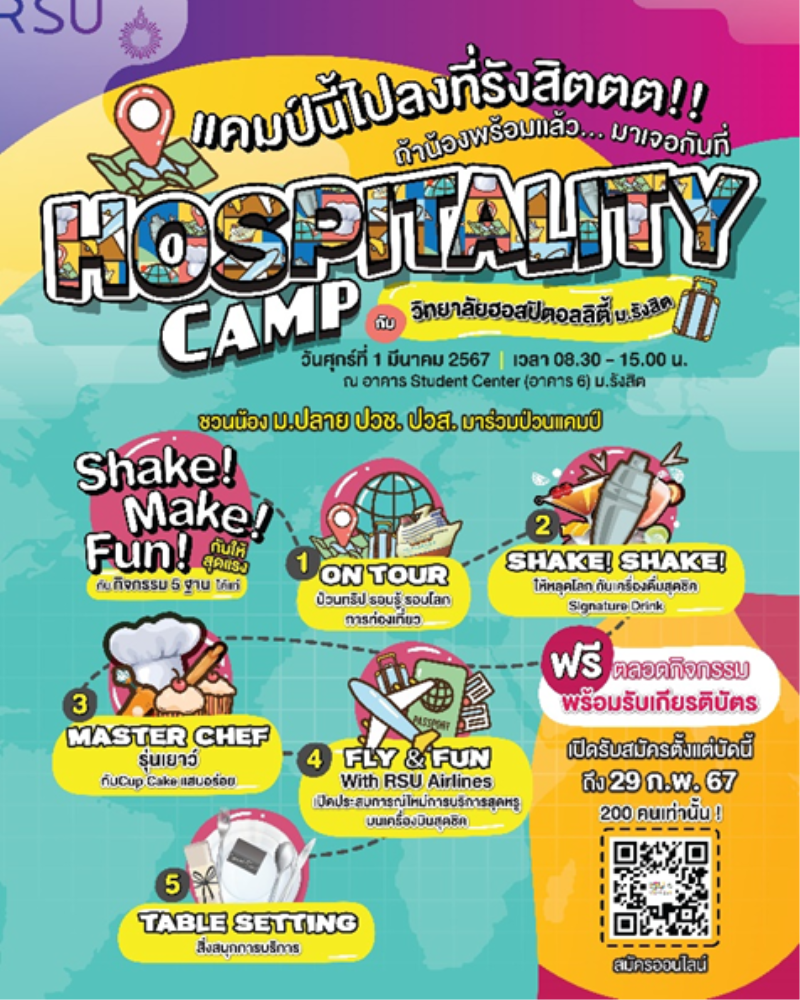 EZ Webmaster February 12, 2024 EZ Webmaster February 12, 2024 ม.รังสิต รับสมัครน้อง ม.ปลาย ปวช. ปวส. ร่วมกิจกรรม “Hospitality Camp กับ วิทยาลัยฮอสปิตอลลิตี้ ม.รังสิต” วิทยาลัยฮอสปิตอลลิตี้ มหาวิทยาลัยรังสิต เปิดรับสมัครน้องนักเรียนมัธยมศึกษาตอนปลาย ปวช. ปวส.ร่วมกิจกรรม Hospitality Camp กับ วิทยาลัยฮอสปิตอลลิตี้ ม.รังสิต จัดขึ้นในวันศุกร์ที่ 1 มีนาคม 2567 เวลา 08.30 -15.00 น. ณ อาคาร Student Center (อาคาร 6) มหาวิทยาลัยรังสิต ภายในงานมีกิจกรรมให้น้อง ๆ ได้เปิดประสบการณ์เกี่ยวกับการบริการ จาก 5 หลักสูตรการเรียนการสอน ได้แก่ 1. On Tour ป่วนทริป รอบรู้ รอบโลก การท่องเที่ยว 2. Shake! Shake! ให้หลุดโลก กับเครื่องดื่มสุดชิค Signature Drink 3. Master chef รุ่นเยาว์ กับ Cup Cake แสนอร่อย 4. FLY & FUN With RSU Airlines เปิดประสบการณ์ใหม่การบริการสุดหรู บนเครื่องบินสุดชิค และ 5. Table Setting สิ่งสนุกการบริการ สำหรับผู้ที่สนใจสามารถสมัครและลงทะเบียนออนไลน์โดยไม่มีค่าใช้จ่ายใดๆ ทั้งสิ้น สมัครได้ตั้งแต่บัดนี้เป็นต้นไป ลงทะเบียนออนไลน์ที่ https://forms.gle/JJTbQM7SfncW2gPc6 รับจำนวนจำกัด 200 คน สอบถามเพิ่มเติมได้ที่เพจ www.facebook.com/COTHRSU